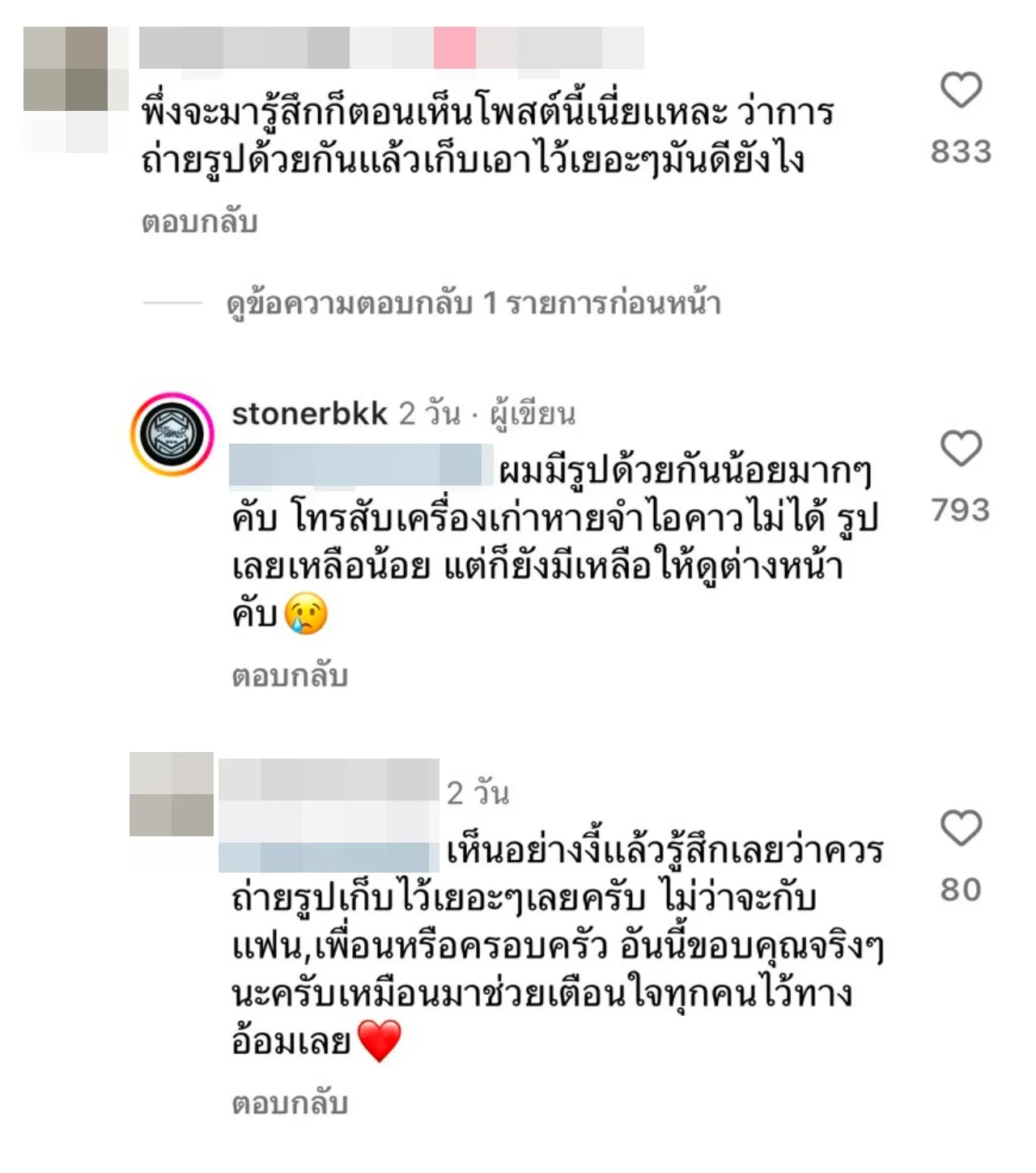 จากนั้นก็ได้มีคนเข้ามาคอมเมนต์เห็นด้วยกับข้อความดังกล่าว บอกว่า “เห็นอย่างนี้แล้วรู้สึกเลยว่าควรถ่ายรูปเก็บไว้เยอะ ๆ เลยครับ ไม่ว่าจะกับแฟน, เพื่อนหรือครอบครัว อันนี้ขอบคุณจริง ๆ นะครับเหมือนมาช่วยเตือนใจทุกคนไว้ทางอ้อมเลย, รู้ตัวเมื่อ 2 ปีที่แล้ว เริ่มถ่ายวิดีโอและรูปคนในครอบครัวไว้มาก และก็จะถ่ายเก็บไว้เรื่อย ๆ มันดีมากจริง ๆ ค่ะ, จริง ๆ เราถ่ายตลอด รูปภาพคือความทรงจำที่ดีค่ะ, เสียดายนะคะ ภาพคู่กันมีน้อย พี่โม คงเหลือภาพอีกมากมาย ในความทรงจำนะคะ พี่เบิร์ด”