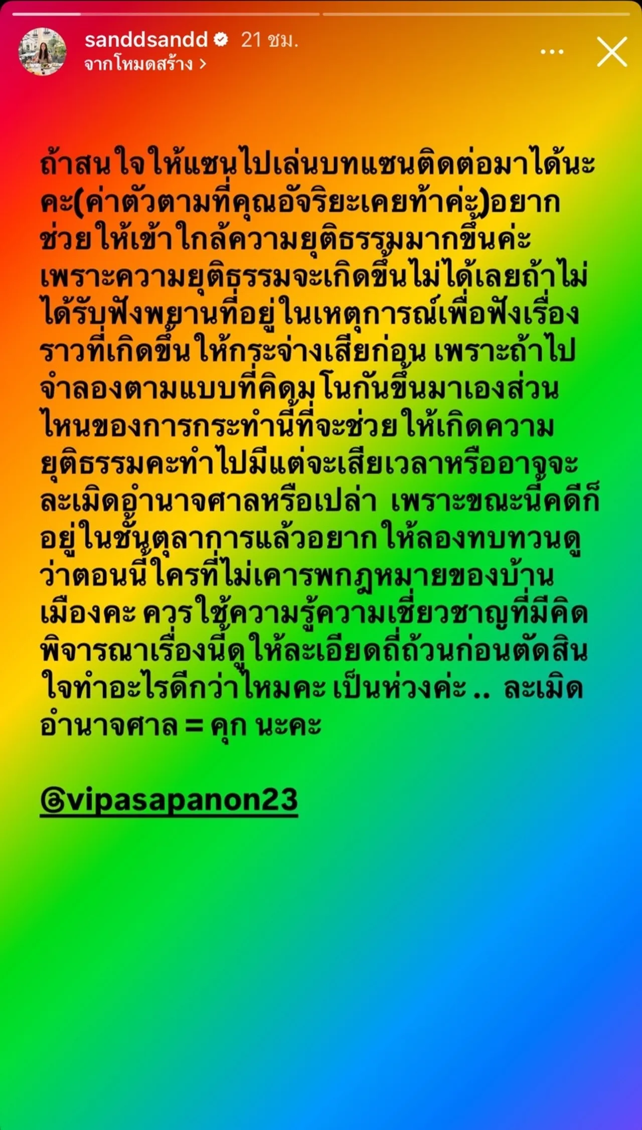ล่าสุด แซน วิศาพัช บอกว่าสนใจอยากเล่นบนตัวเอง โดยโพสต์ข้อความผ่านทางไอจีสตอรี่ @sanddsandd ระบุว่า “ถ้าสนใจให้แซนไปเล่นบทแซน ติดต่อมาได้นะคะ (ค่าตัวตามที่คุณอัจฉริยะเคยท้าค่ะ) อยากช่วยให้เข้าใกล้ความยุติธรรมมากขึ้นค่ะ เพราะความยุติธรรมจะเกิดขึ้นไม่ได้เลย ถ้าไม่ได้รับฟังพยานที่อยู่ในเหตุการณ์ เพื่อฟังเรื่องราวที่เกิดขึ้นให้กระจ่างเสียก่อน