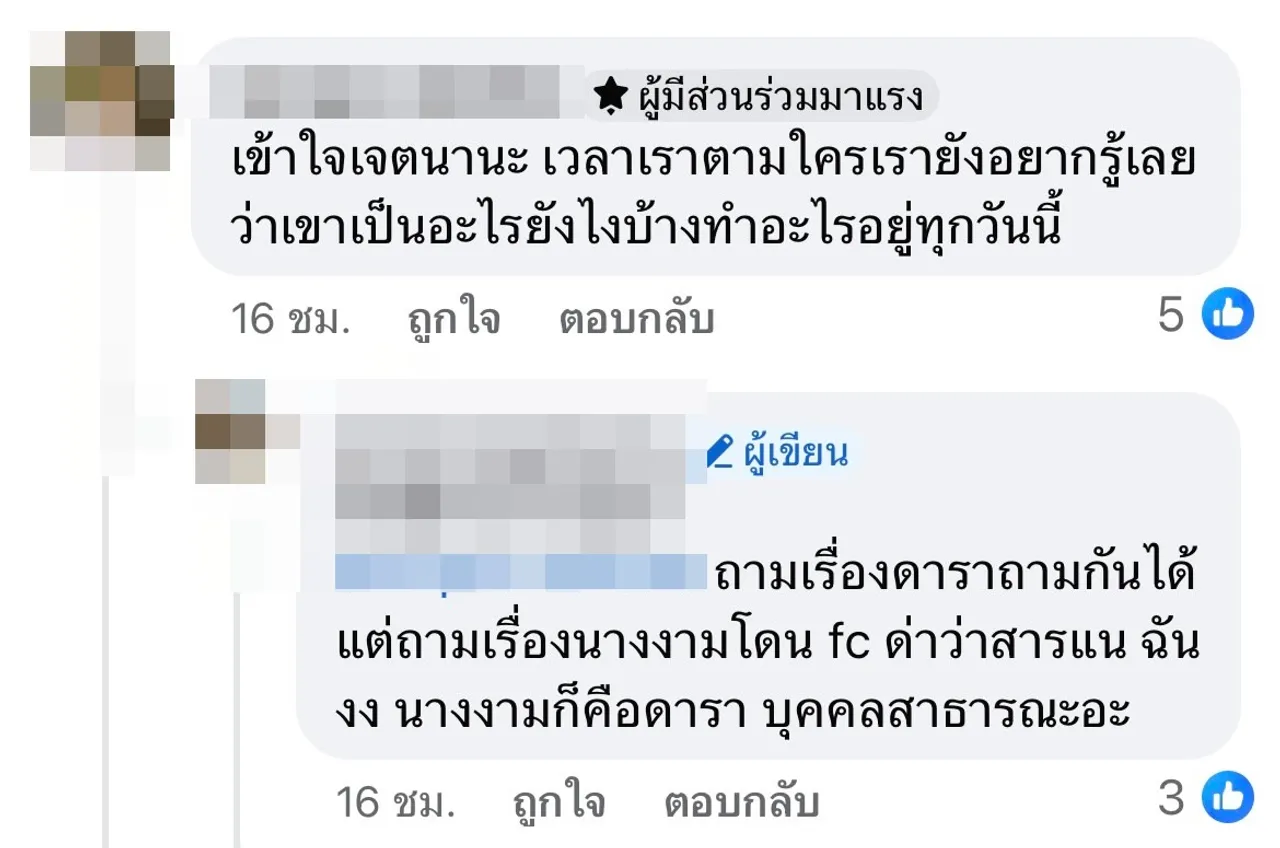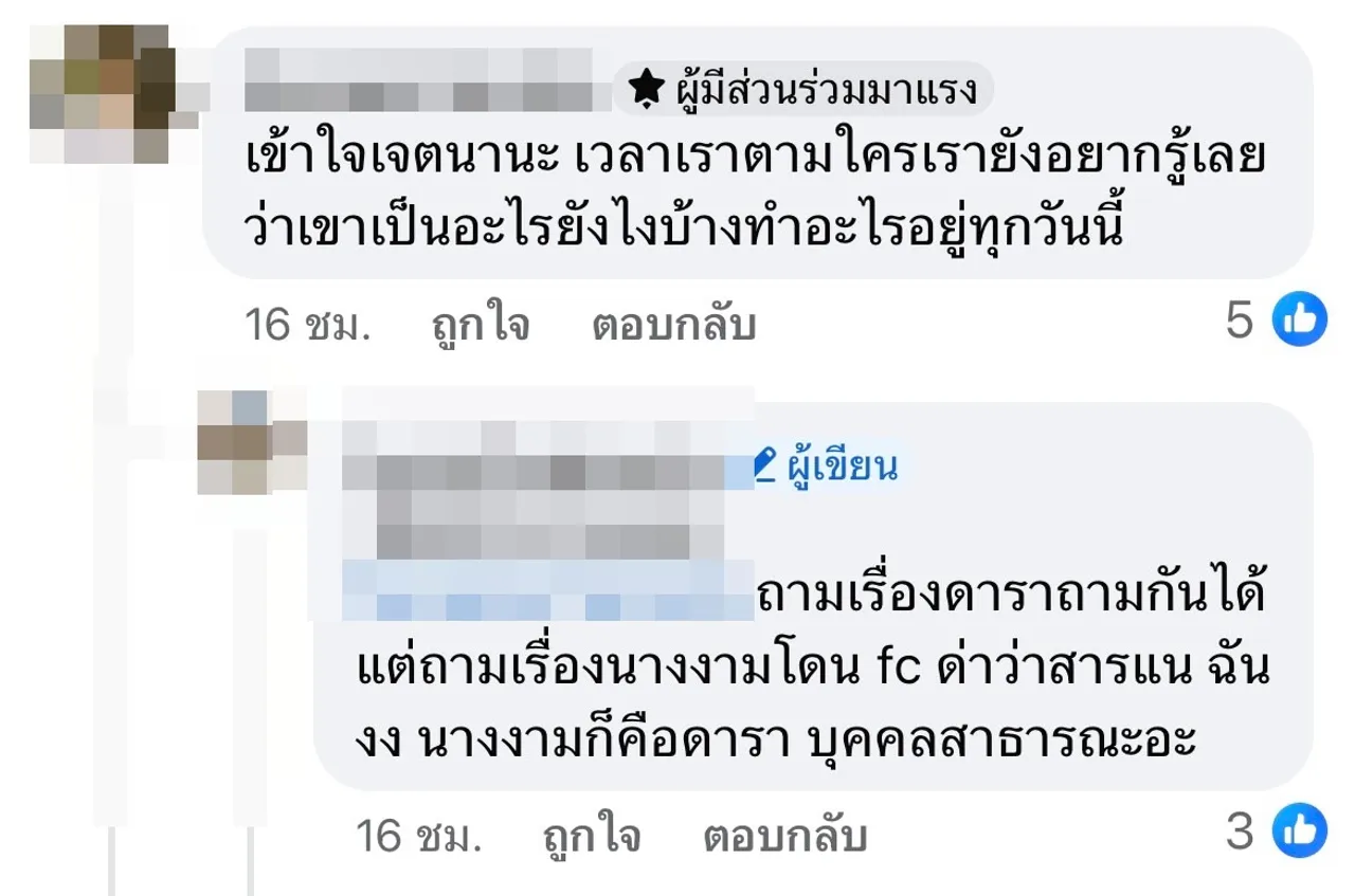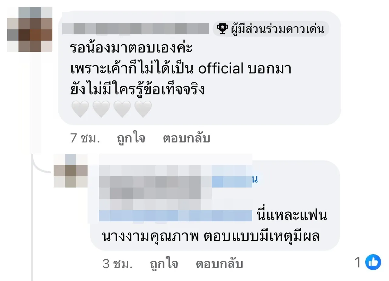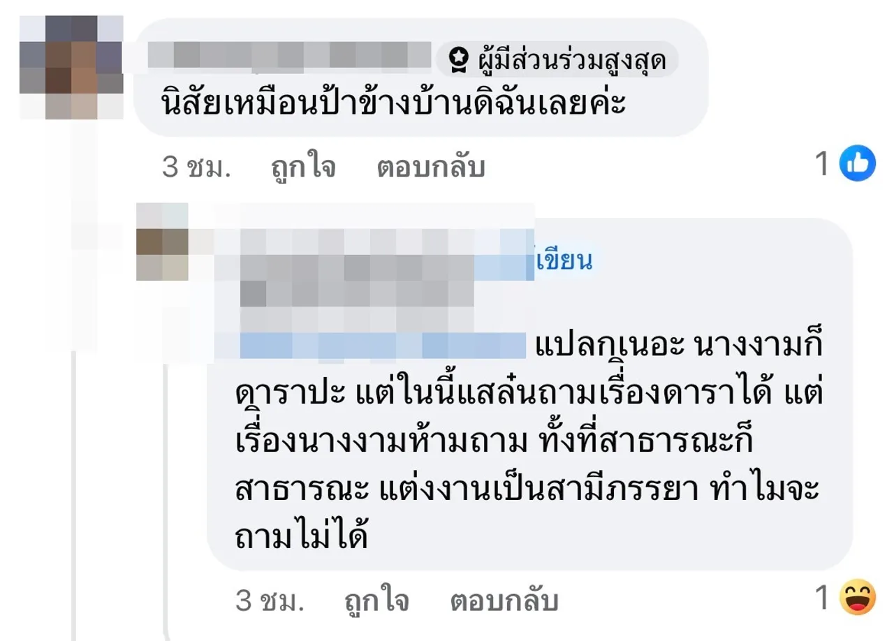 งานนี้ก็มีอีกเสียงที่มาคอมเมนต์แสดงความคิดเห็นอีกมุมว่า “เค้าแค่ถามเอง, แปลกเนอะ นางก็ดาราปะ แต่ในนี้แสล๋นถามเรื่องดาราได้ แต่เรื่องนางงามห้ามถาม ทั้งที่สาธารณะก็สาธารณะ แต่งงานเป็นสามีภรรยา ทำไมจะถามไม่ได้, เข้าใจเจตนานะ เวลาเราตามใครเรายังอยากรู้เลยว่าเขาเป็นอะไร ยังไงบ้าง ทำอะไรอยู่ทุกวันนี้, ถามเรื่องดาราถามกันได้ แต่ถามเรื่องนางงาม โดน FC ด่าว่าสาระแน ฉันงง นางงามก็คือดารา บุคคลสาธารณะอะ”
