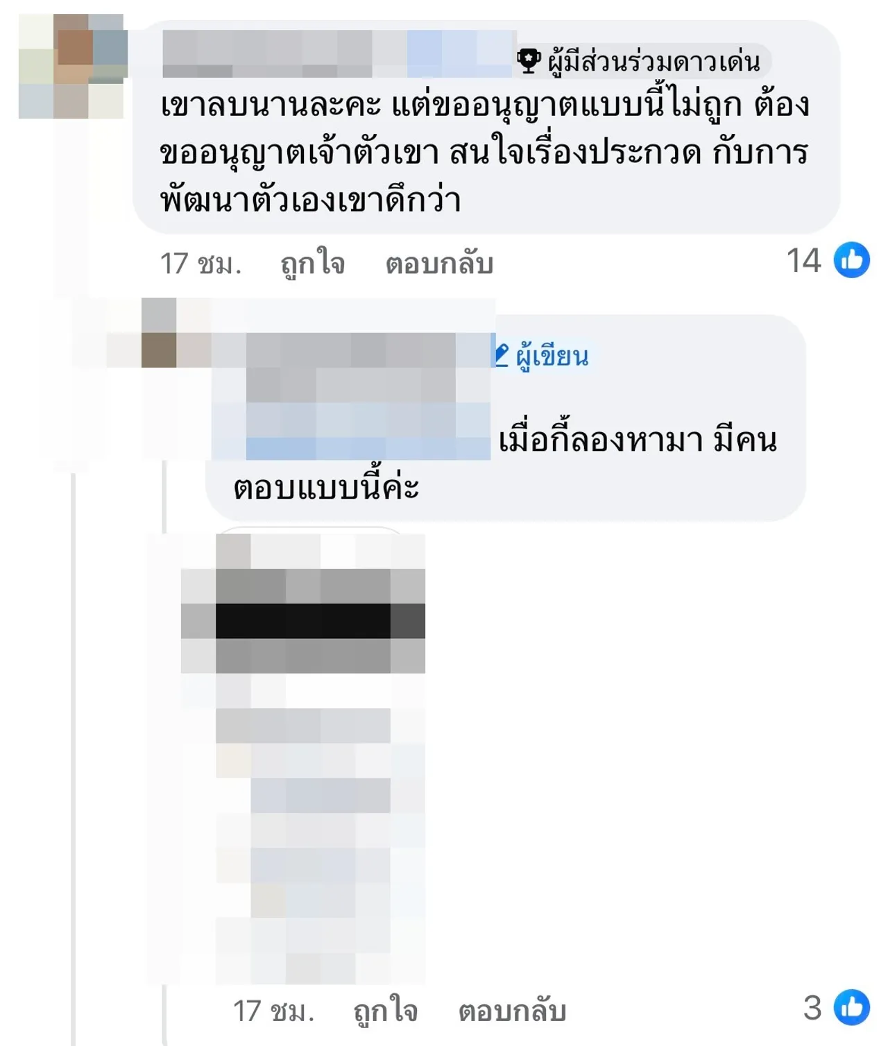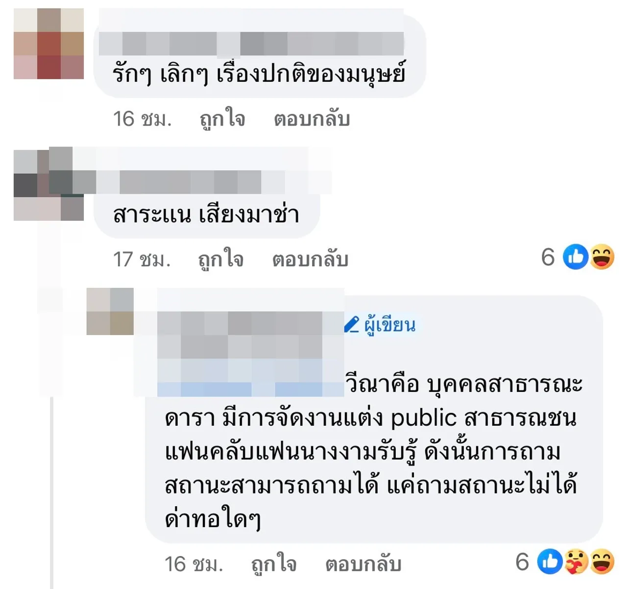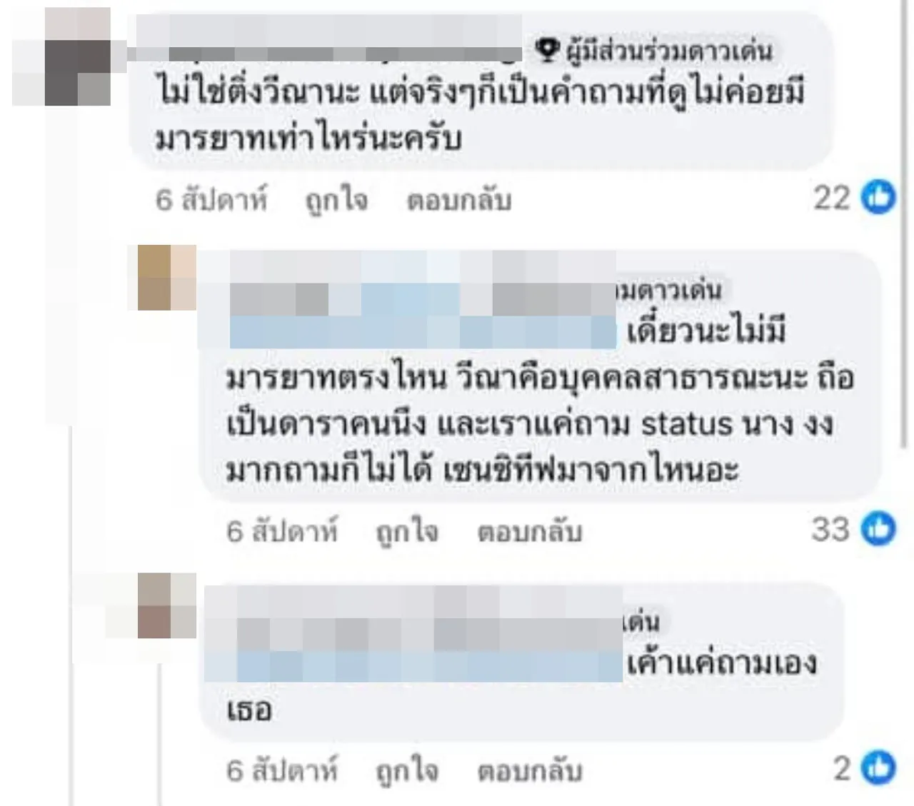 งานนี้ก็มีอีกเสียงที่มาคอมเมนต์แสดงความคิดเห็นอีกมุมว่า “เค้าแค่ถามเอง, แปลกเนอะ นางก็ดาราปะ แต่ในนี้แสล๋นถามเรื่องดาราได้ แต่เรื่องนางงามห้ามถาม ทั้งที่สาธารณะก็สาธารณะ แต่งงานเป็นสามีภรรยา ทำไมจะถามไม่ได้, เข้าใจเจตนานะ เวลาเราตามใครเรายังอยากรู้เลยว่าเขาเป็นอะไร ยังไงบ้าง ทำอะไรอยู่ทุกวันนี้, ถามเรื่องดาราถามกันได้ แต่ถามเรื่องนางงาม โดน FC ด่าว่าสาระแน ฉันงง นางงามก็คือดารา บุคคลสาธารณะอะ”