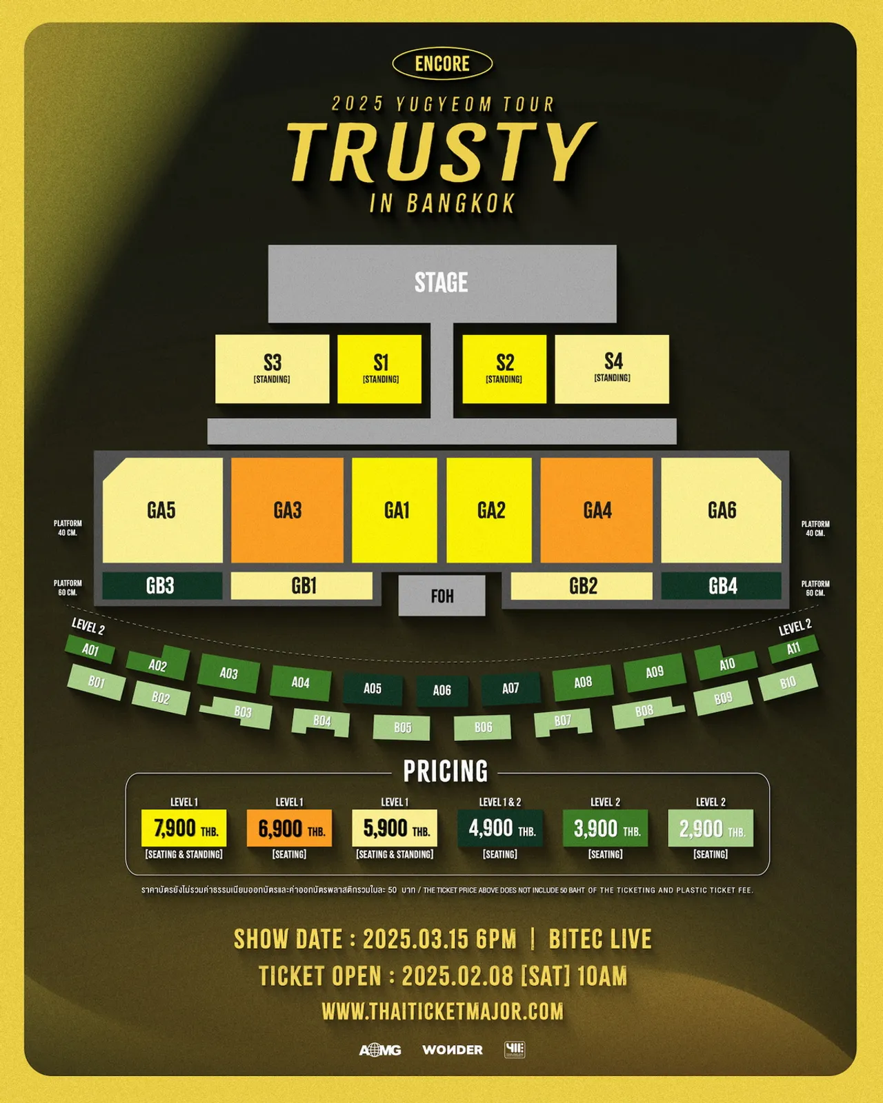 ร่วมด้วยวลีไม่เกินจริงที่ว่า… ไทยแลนด์แดนอากาเซ่! คิกออฟอีเวนต์แรกแห่งปี 2025 จากผู้จัดไทยคุณภาพที่หลายด้อมถามหาด้วยความคิดถึงอย่าง โฟร์ วัน วัน เอ็นเตอร์เทนเม้นท์ ของ กึ้ง เฉลิมชัย จึงจับมือต้นสังกัด เอโอเอ็มจี (AOMG) และ วันเดอร์ (WONDER) ประเทศเกาหลีใต้ ประกาศจัดคอนเสิร์ต “2025 ยูคยอม ทัวร์ [ทรัสตี้] อังกอร์ อิน แบงคอก” (2025 YUGYEOM TOUR [TRUSTY] ENCORE IN BANGKOK) ที่ประเทศไทยในวันเสาร์ที่ 15 มีนาคม 2568 เวลา 18:00 น. ณ ไบเทค ไลฟ์ (BITEC Live) #2025TRUSTY_ENCORE_IN_BANGKOK