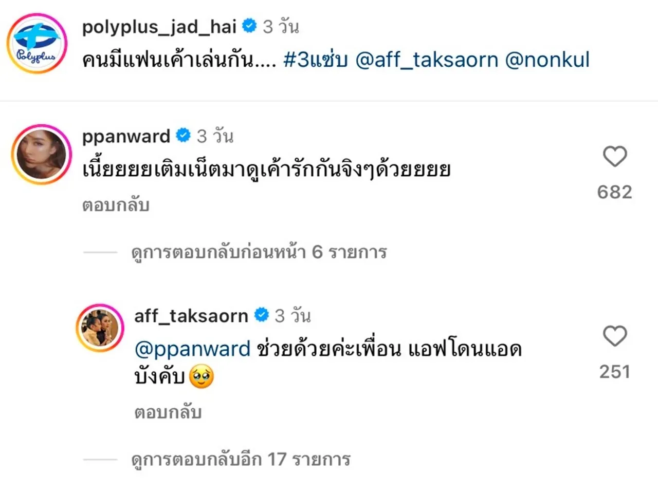 ล่าสุดอินสตาแกรม @polyplus_jad_hai ก็ทำเอาแฟนๆ ใจฟูอีกครั้งสมสโลแกนโพลีพลัสจัดให้ กับคลิปน่ารัก แอฟ ยอมเต้นคู่กับ นนกุล แม้จะเป็นคลิปสั้นๆ เพียงไม่กี่วินาที แต่บอกเลยว่าน่ารักมากๆ สีหน้าทั้ง แอฟ-นนกุล ดูเขินๆ และมีความสุขที่มีโมเมนต์ดีๆ ร่วมกัน พร้อมทั้งเขียนแคปชั่น “คนมีแฟนเค้าเล่นกัน…. #3แซ่บ @aff_taksaorn @nonkul”
