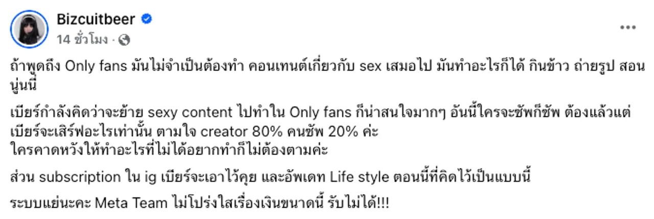 ส่วน subscription ใน ig เบียร์จะเอาไว้คุย และอัพเดท Life style ตอนนี้ที่คิดไว้เป็นแบบนี้ ระบบแย่นะคะ Meta Team ไม่โปร่งใสเรื่องเงินขนาดนี้ รับไม่ได้!!!”