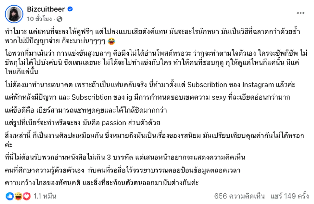 “ถ้าพูดถึง Only fans มันไม่จำเป็นต้องทำ คอนเทนต์เกี่ยวกับ sex เสมอไป มันทำอะไรก็ได้ กินข้าว ถ่ายรูป สอนนู่นนี่ เบียร์กำลังคิดว่าจะย้าย sexy content ไปทำใน Only fans ก็น่าสนใจมากๆ อันนี้ใครจะซัพก็ซัพ ต้องแล้วแต่เบียร์จะเสิร์ฟอะไรเท่านั้น ตามใจ creator 80% คนซัพ 20% ค่ะ ใครคาดหวังให้ทำอะไรที่ไม่ได้อยากทำก็ไม่ต้องตามค่ะ