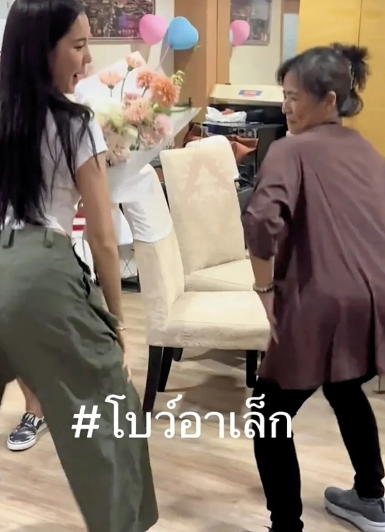 “ไม่มีซ้ำคอนเทนต์เลย ไม่คิดว่าจะมีคอนเทนต์นี้ขึ้นมา ก็อยากให้พี่ๆ อารมณ์ดี คือเรากับเพื่อนๆ ทเวิร์กกันปกติ จังหวะนั้นแม่มาพอดี ไหนแม่ลองซิ แม่ก็เล่นด้วย ตอนแรกจะชวนป๊ามาเล่นด้วยแล้วแต่ป๊าจิบไวน์อยู่ พี่เล็กก็อึ้ง ไม่ใช่อะไร แม่เพิ่งไปฉีดเข่ามา (หัวเราะ) แม่ปวดเข่า เฮ้ย ยาออกฤทธิ์แล้วเหรอ (หัวเราะ)”