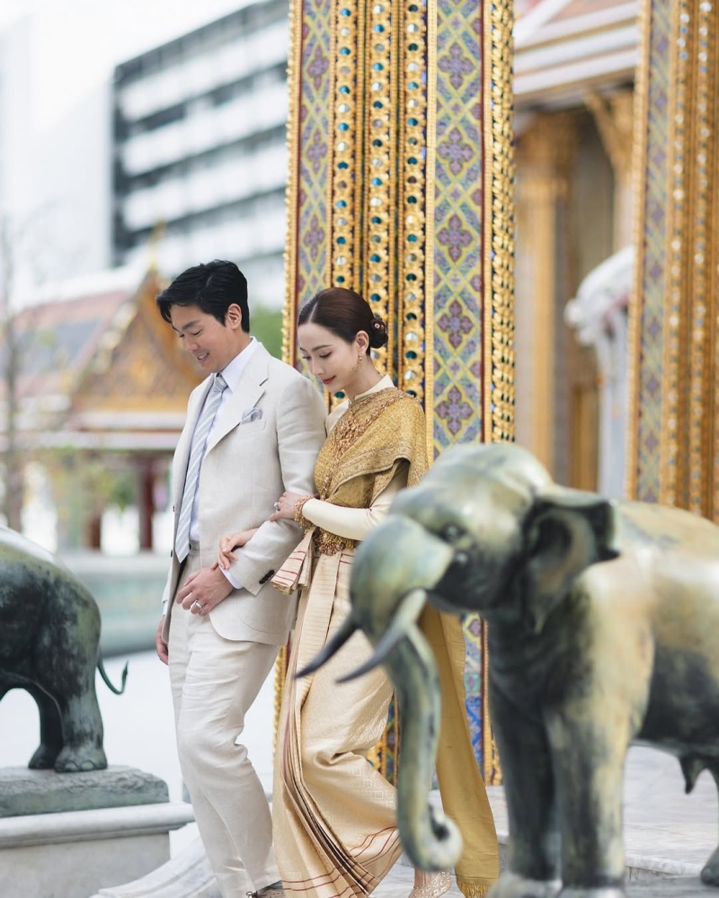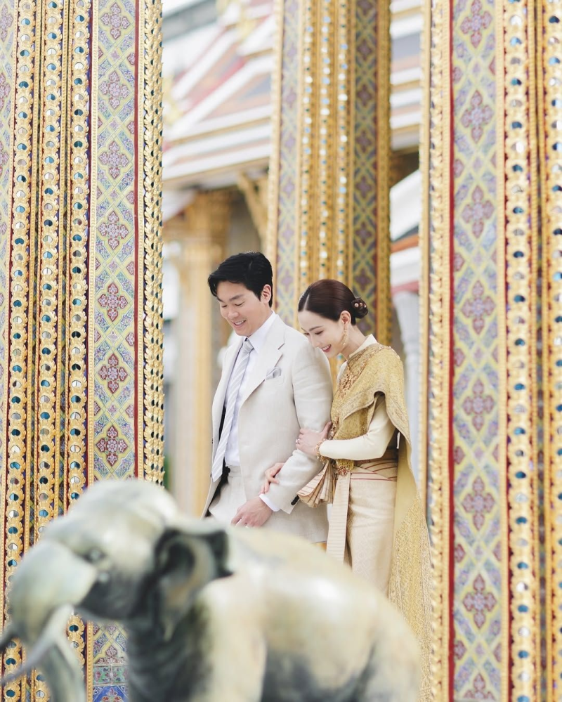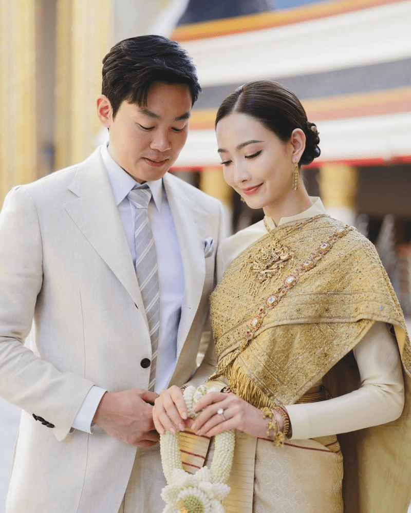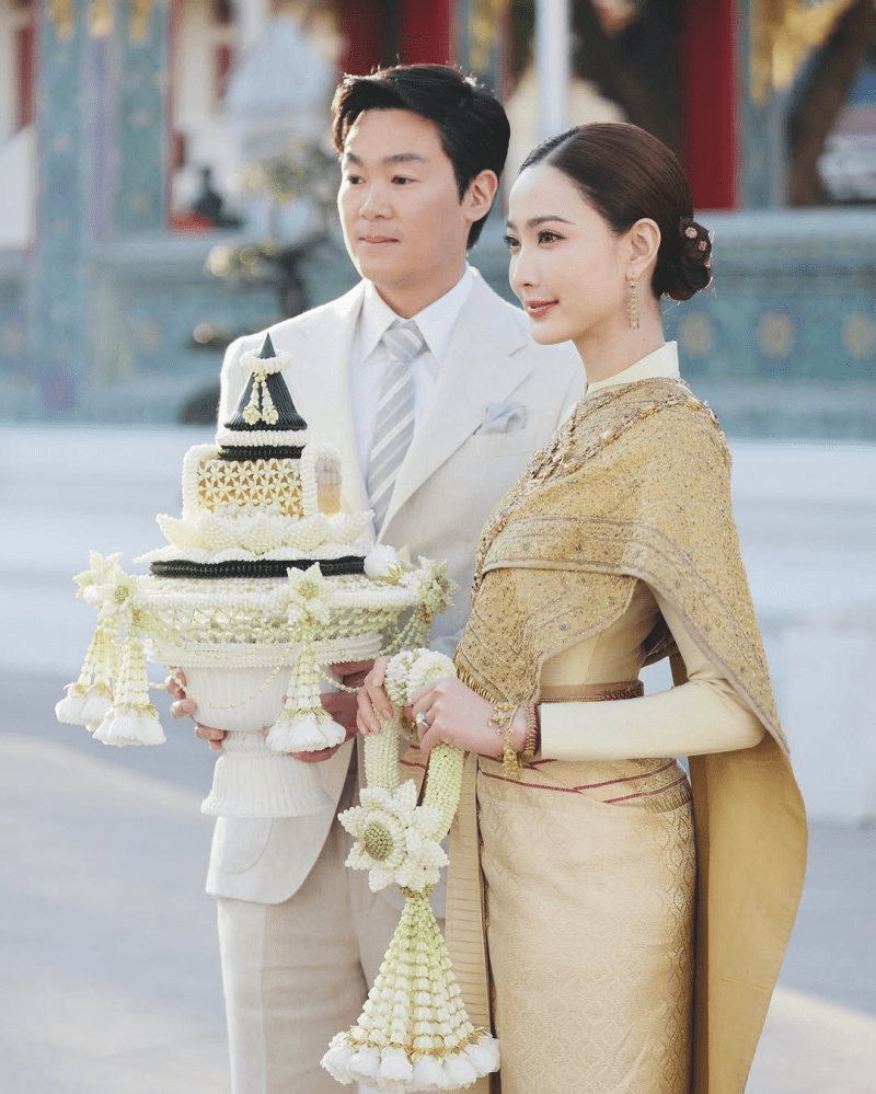 ‘แต้ว ณฐพร’สวมชุดไทยงดงาม ควงว่าที่เจ้าบ่าวเข้าพิธีรับน้ำพระพุทธมนต์