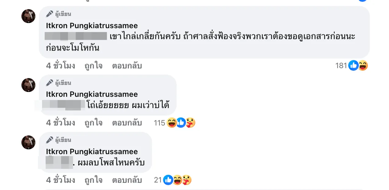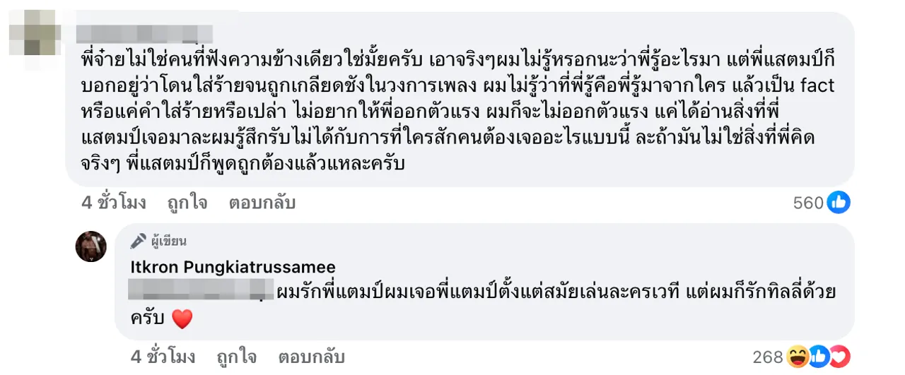 นอกจากนี้จ๋ายยังได้เข้าไปตอบเมนต์หนึ่งที่ถามว่า “พี่จ๋ายไม่ใช่คนที่ฟังความข้างเดียวใช่มั้ยครับ เอาจริงๆผมไม่รู้หรอกนะว่าพี่รู้อะไรมา แต่พี่แสตมป์ก็บอกอยู่ว่าโดนใส่ร้ายจนถูกเกลียดชังในวงการเพลง ผมไม่รู้ว่าที่พี่รู้คือพี่รู้มาจากใคร แล้วเป็น fact หรือแค่คำใส่ร้ายหรือเปล่า ไม่อยากให้พี่ออกตัวแรง ผมก็จะไม่ออกตัวแรง แค่ได้อ่านสิ่งที่พี่แสตมป์เจอมาละผมรู้สึกรับไม่ได้กับการที่ใครสักคนต้องเจออะไรแบบนี้ ละถ้ามันไม่ใช่สิ่งที่พี่คิดจริงๆ พี่แสตมป์ก็พูดถูกต้องแล้วแหละครับ”