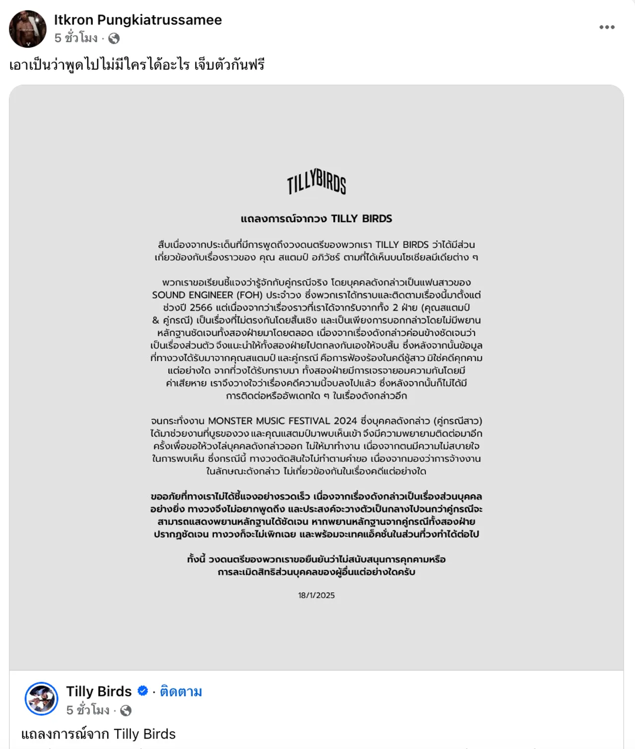 เพราะนักร้องหนุ่ม จ๋าย ไททศมิตร หรือ อิชณน์กร พึ่งเกียรติรัศมี แชร์โพสต์ของวง Tilly Birds ที่ออกมาแถลงว่ามีส่วนเกี่ยวข้องกับเรื่องราวของ แสตมป์ อภิวัชร์ และภรรยา โดย Tilly Birds ยอมรับว่ารู้จักสาวคู่กรณีแสตมป์จริง และยืนยันว่าเป็นกลาง แต่ได้รับข้อมูลที่ไม่ตรงกันจากทั้ง 2 ฝ่าย ส่วนคดีฟ้องร้องคือคดีชู้สาว ไม่ใช่คดีคุกคามแต่อย่างใด