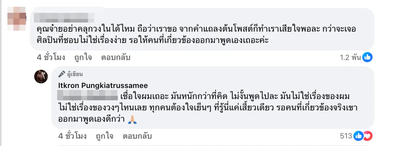 และนักร้องหนุ่มชื่อดังก็ได้ตอบกลับเมนต์ดังกล่าวว่า “เชื่อใจผมเถอะ มันหนักกว่าที่คิด ไม่งั้นผมพูดไปละ มันไม่ใช่เรื่องของผมไม่ใช่เรื่องของวงๆ ไหนเลย ทุกคนต้องใจเย็นๆ ที่รู้นี่แค่เสี้ยวเดียว รอคนที่เกี่ยวข้องจริงเขาออกมาพูดเองดีกว่า”