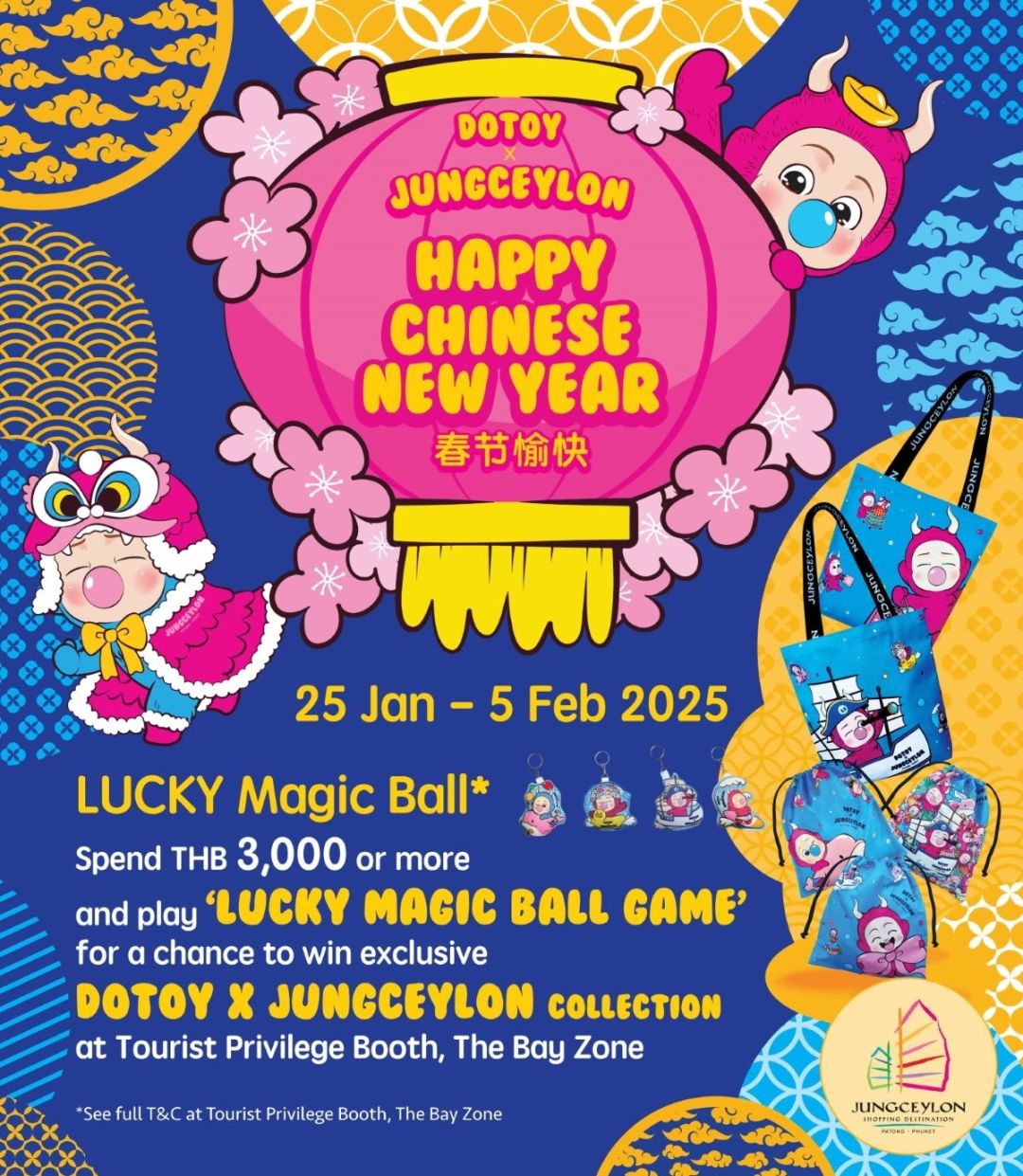 นายประวิช จรรยาสิทธิกุล ประธานเจ้าหน้าที่บริหาร ศูนย์การค้าจังซีลอน ป่าตอง ภูเก็ต กล่าวว่า ในปีนี้ “จังซีลอน” ได้เตรียมจัดกิจกรรมและโปรโมชั่นต้อนรับเทศกาลตรุษจีนที่กำลังจะมาถึงอย่างยิ่งใหญ่เช่นเคย โดยในงาน “Happy Chinese New Year 2025” นี้จะพิเศษและน่ารักยิ่งขึ้น ด้วยการนำ “แองเจิ้ลบอย” (Angel Boy) ผลงานจากศิลปินชาวเกาหลี คุณยุน คีซอค (Yoon Kiseok) และ คุณมิน คยองซุน (Min Kyungsun) จากค่าย DOTOY (DO IT YOURSELF TOY) มาร่วมคอลแลบส์และครีเอตไอเทมพิเศษตรุษจีน ตกแต่งบรรยากาศภายในศูนย์การค้าฯ ต่อเนื่องจากช่วงคริสต์มาสและปีใหม่ที่ผ่านมา กับ “DOTOY X JUNGCEYLON Happy Chinese New Year” ดึงแครักเตอร์เด็กน้อยขี้เล่นแสนซนในชุดปีศาจมีเขา ชอบเคี้ยวหมากฝรั่งและเป่าลม มาร่วมอวยพรในเทศกาลแห่งความเป็นสิริมงคล เสริมโชคลาภ เพิ่มการตกแต่งด้วย “สีทอง” สัญลักษณ์ของความมั่งคั่ง ร่ำรวย มั่งมีศรีสุข และเจริญรุ่งเรือง อาทิ น้องแองเจิ้ลบอยบนก้อนเงินก้อนทอง หรือหยวนเป่านำโชค, น้องแองเจิ้ลบอยในชุดเชิดสิงโตแสนน่ารักสัญลักษณ์แห่งพลังอำนาจความกล้าหาญ และน้องแองเจิ้ลบอยในชุดถังจวงที่กำลังเล่นประทัดอย่างสนุกสนานสัญลักษณ์ของการขับไล่สิ่งชั่วร้ายออกไปและทำให้กิจการเจริญรุ่งเรือง เฮง เฮง เป็นต้น