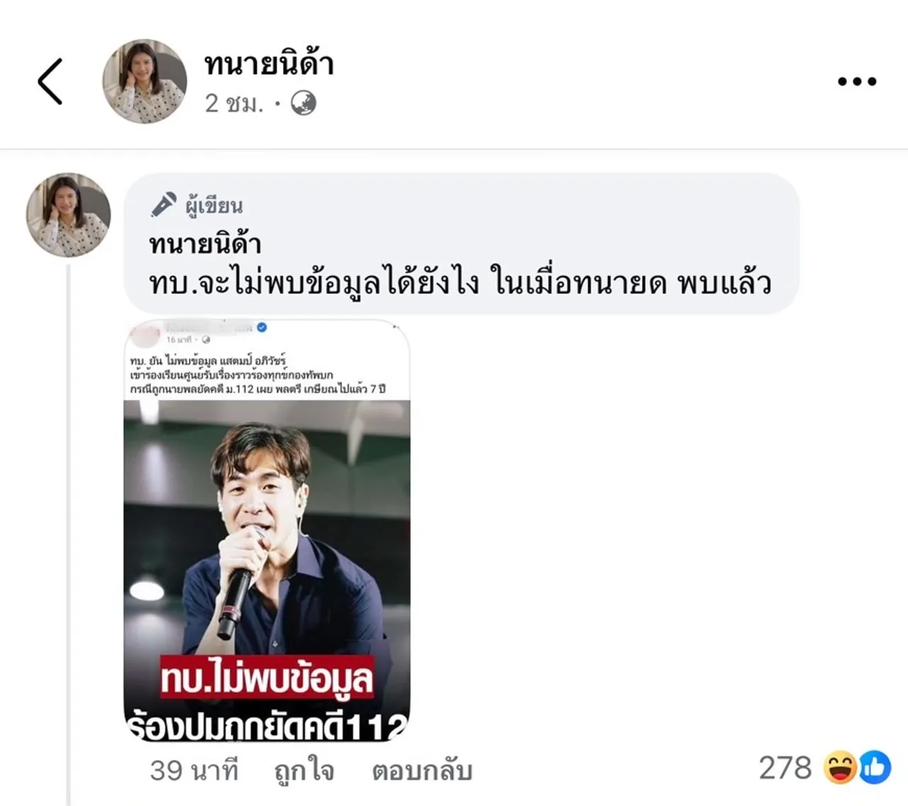 จากนั้นก็โพสต์ภาพคอมเมนต์ของเพจดังกล่าว เขียนข้อความว่า “อยากให้นายพลออกมาชี้แจงหน่อยค่ะ ทำไมข้อมูลถึงได้คลาดเคลื่อน” รวมถึงภาพข่าว ทบ. ไม่พบข้อมูล แสตมป์ ร้องเรียนถูกยัดคดี 112 และเขียนข้อความ “ทบ. จะไม่พบข้อมูลได้ยังไง ในเมื่อทนาย ด พบแล้ว”