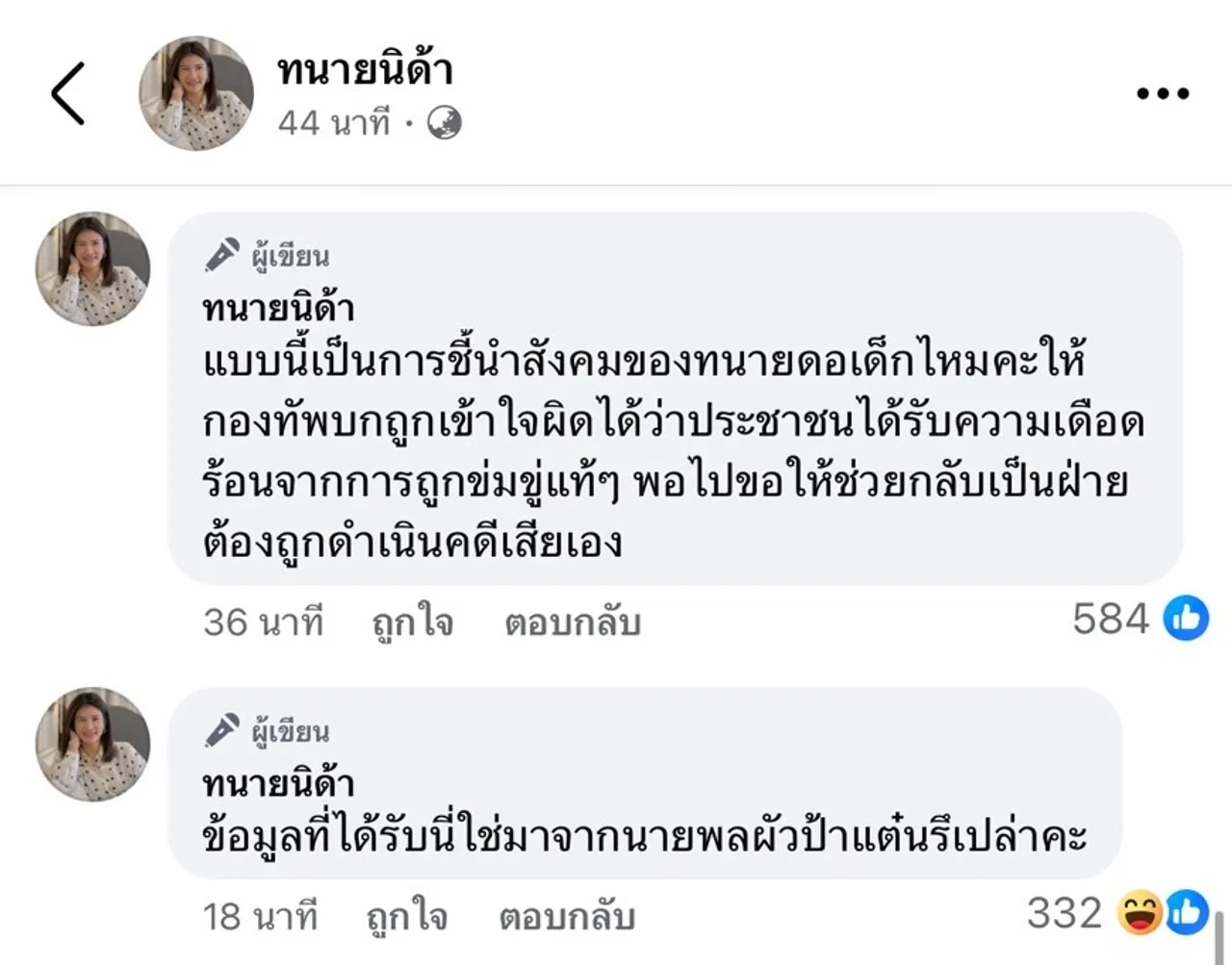 อีกทั้งคอมเมนต์เพิ่มเติมว่า “แบบนี้เป็นการชี้นำสังคมของทนายดอเด็กไหมคะ ให้กองทัพบกถูกเข้าใจผิดได้ว่าประชาชนได้รับความเดือดร้อนจากการถูกข่มขู่แท้ๆ พอไปขอให้ช่วยกลับเป็นฝ่ายต้องถูกดำเนินคดีเสียเอง” และ “ข้อมูลที่ได้รับนี่ใช่มาจากนายพลผัวป้าแต๋นรึเปล่าคะ”