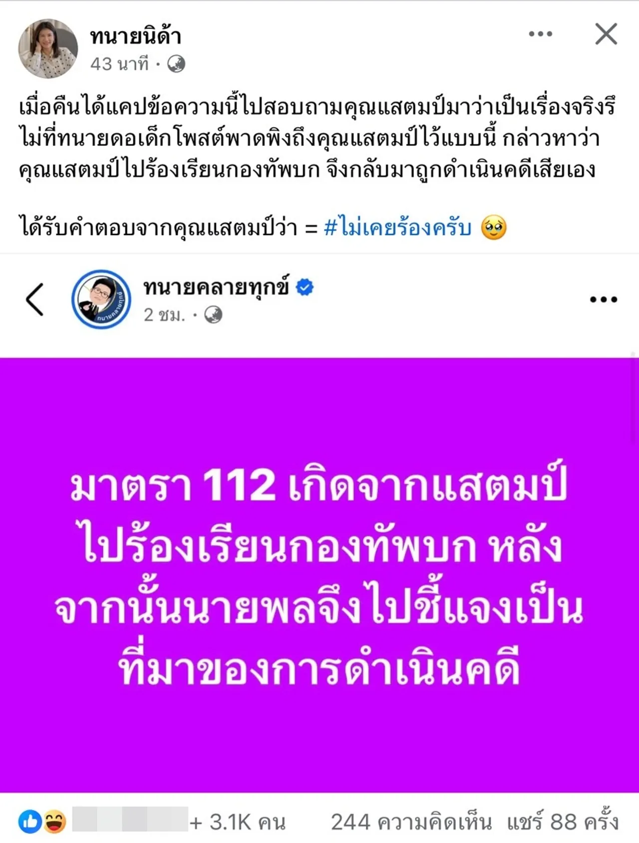 ก่อนจะโพสต์ข้อความเพิ่มเติมในคอมเมนต์ว่า “ผมได้รับแจ้งจากนายพลว่าคุณแสตมป์ได้ไปร้องเรียนกองทัพบกว่า นายพลนั้นใช้มาตรา 112 ไปข่มขู่ หลังจากนั้นมีการสอบสวนและสรุปว่ามีข้อความที่น่าจะหมิ่นสถาบัน จึงมีการดำเนินคดีตามกฎหมายครับ”