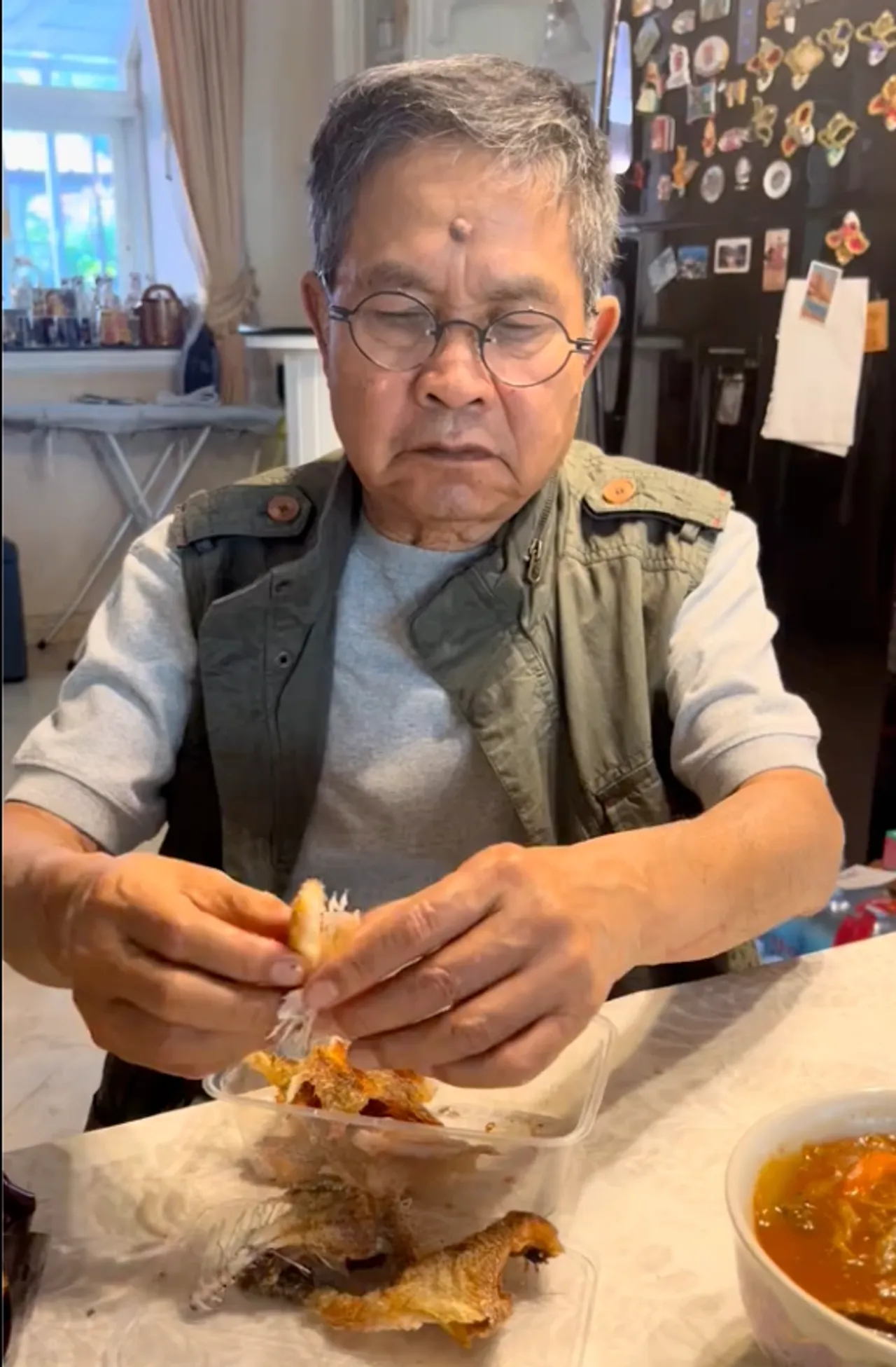 ซึ่ง ปู กนกวรรณ ได้โพสต์คลิปแชร์โมเมนต์น่ารักๆ ของสามีที่ไม่เคยมีใครได้เห็นในมุมอ่อนโยนของตลกรุ่นใหญ่ชื่อดังคนนี้ กับการนั่งแกะปลาให้ภรรยาทาน ซึ่งในคลิป ปูถามสามีว่าทำอะไร ซึ่งเด๋อก็ตอบว่า แกะปลาสลิด เพราะถ้าไม่แกะเมียก็ไม่กิน ก่อนจะพูดขำๆ ว่า แกะเสร็จแล้วก็ต้องเคี้ยวและป้อนใส่ปาก