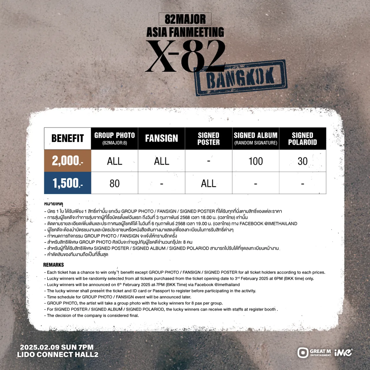 ย้ำอีกครั้ง! “82MAJOR” ดีใจ และตื่นเต้นสุดๆ ที่จะได้มามอบความสุขให้แฟนคลับที่เมืองไทยในงาน “2025 82MAJOR <X-82> ASIA FAN MEETING in BANGKOK” ซึ่งจะจัดขึ้นในวันอาทิตย์ที่ 9 กุมภาพันธ์ 2568 ณ LIDO CONNECT HALL2