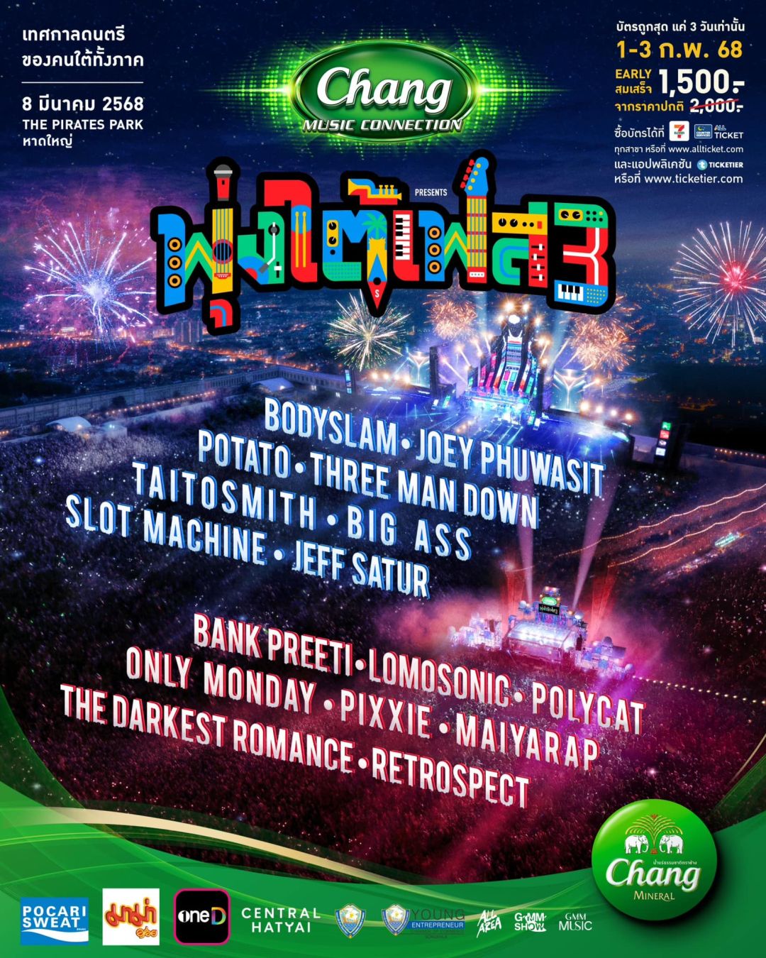 เทศกาลดนตรีที่ยิ่งใหญ่ที่สุดในภาคใต้กลับมาอีกครั้งในปีที่ 3 Chang Music Connection presents “พุ่งใต้เฟส3” พร้อมสร้างปรากฏการณ์ความสนุกสุดมัน! ที่เป็นมากกว่างานดนตรีแต่เป็นเทศกาลแห่งความภาคภูมิใจของชาวใต้ ทุกคนที่จะรวมพลังและหัวใจไว้เป็นหนึ่งเดียวท่ามกลางเสียงเพลงและบรรยากาศแห่งความสุขใจกลางเมืองหาดใหญ่ ร่วมสัมผัสประสบการณ์สุดยิ่งใหญ่ และปลดปล่อยความสนุกไปด้วยกัน ภายใต้การจัดงานโดยทีมผู้จัดALL AREA จาก GMM SHOW ในวันเสาร์ที่ 8 มีนาคม 2568 ณ สวนน้ำ เดอะไพเรท ปาร์ค หาดใหญ่ (The Pirates Park Hatyai) พร้อมพุ่งทะยานความสนุกสุดเหวี่ยงไปกับ 16 ศิลปินตัวท็อปแถวหน้าของเมืองไทย 1วัน 2 เวทีที่ต้องห้ามพลาด! ในหลากหลายสไตล์และแนวเพลง เตรียมมาสร้างปรากฏการณ์ความสนุกสุดขีดให้สะท้านกันทั้งภาคใต้ นำทีมโดย BODYSLAM , POTATO, BIG ASS, THREE MAN DOWN, TAITOSMITH, POLYCAT, LOMOSONIC, และ SLOT MACHINE พร้อมทั้งเซอร์ไพรส์พิเศษ! กับ 8 ศิลปินที่มางานพุ่งใต้เฟสเป็นครั้งแรก JOEY PHUWASIT, JEFF SATUR, PIXXIE, BANK PREETI, RETROSPECT, MAIYARAP, ONLY MONDAY, และ THE DARKEST ROMANCE