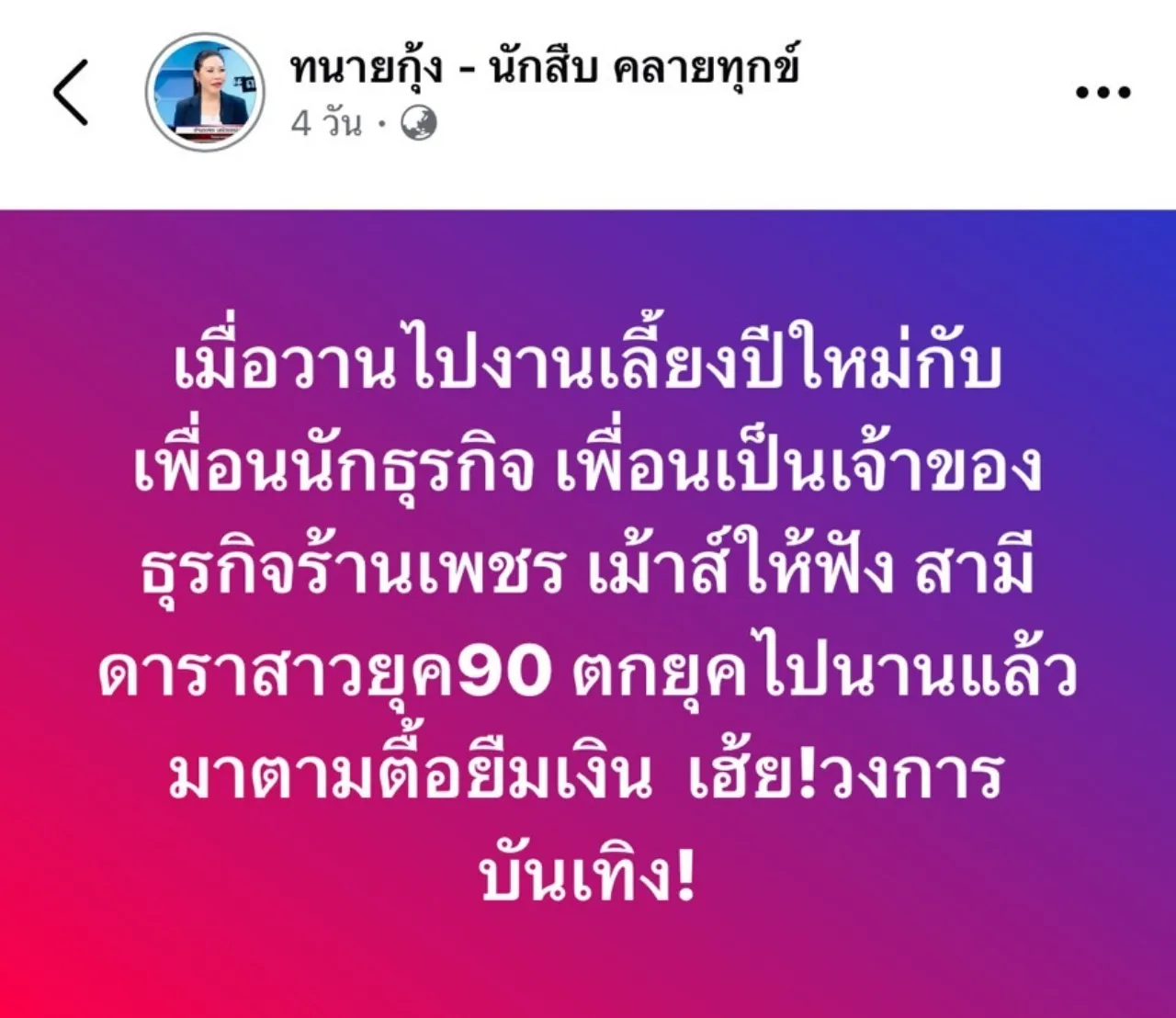 “เมื่อวานไปงานเลี้ยงปีใหม่กับเพื่อนนักธุรกิจ เพื่อนเป็นเจ้าของธุรกิจร้านเพชร เม้าท์ให้ฟัง สามีดาราสาวยุค 90 ตกยุคไปนานแล้ว มาตามตื้อยืมเงิน เฮ้ย! วงการบันเทิง!”