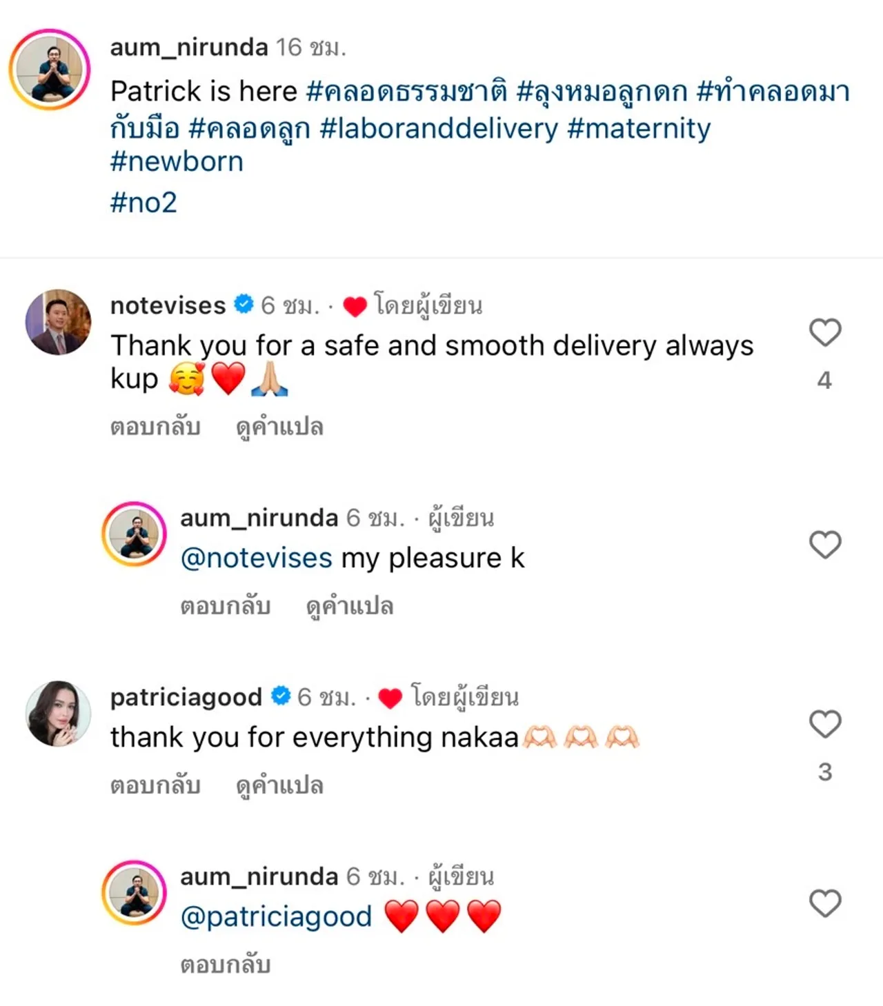 ด้าน แพทริเซีย ก็เข้ามาแสดงความคิดเห็นว่า “thank you for everything nakaa” ในขณะที่ โน้ต วิเศษ บอกว่า “Thank you for a safe and smooth delivery always kup” และมีแฟนๆ เข้ามาแสดงความยินดีมากมาย บันเทิงไทยรัฐออนไลน์ขอแสดงความยินดีด้วยนะคะ