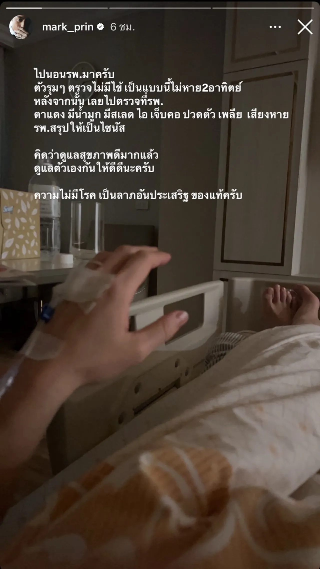 โดย หมาก ปริญ โพสต์ภาพลงไอจีสตอรี่ตอนพักรักษาตัวใน รพ. และเขียนข้อความว่า “ไปนอน รพ. มาครับ ตัวรุม ตรวจไม่มีไข้ เป็นแบบนี้ไม่หาย 2 อาทิตย์ หลังจากนั้นเลยไปตรวจที่ รพ. ตาแดง มีน้ำมูก มีสเลด ไอ เจ็บคอ ปวดตัว เพลีย เสียงหาย รพ. สรุปให้เป็นไซนัส คิดว่าดูแลสุขภาพดีมากแล้ว ดูแลตัวเองกันให้ดีๆ นะครับ ความไม่มีโรคเป็นลาภอันประเสริฐของแท้ครับ”