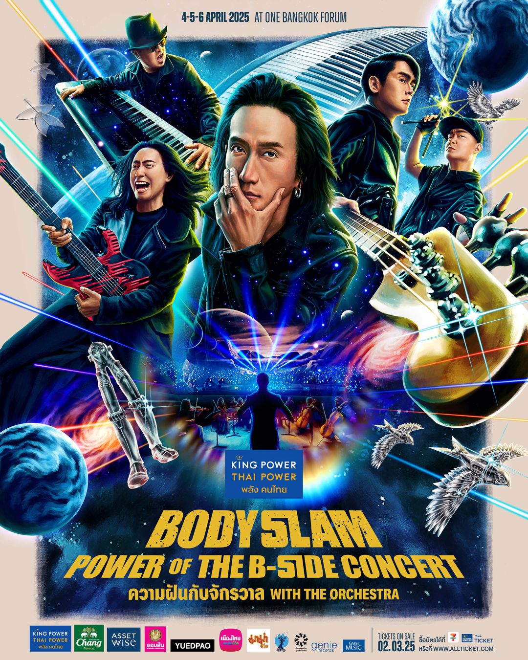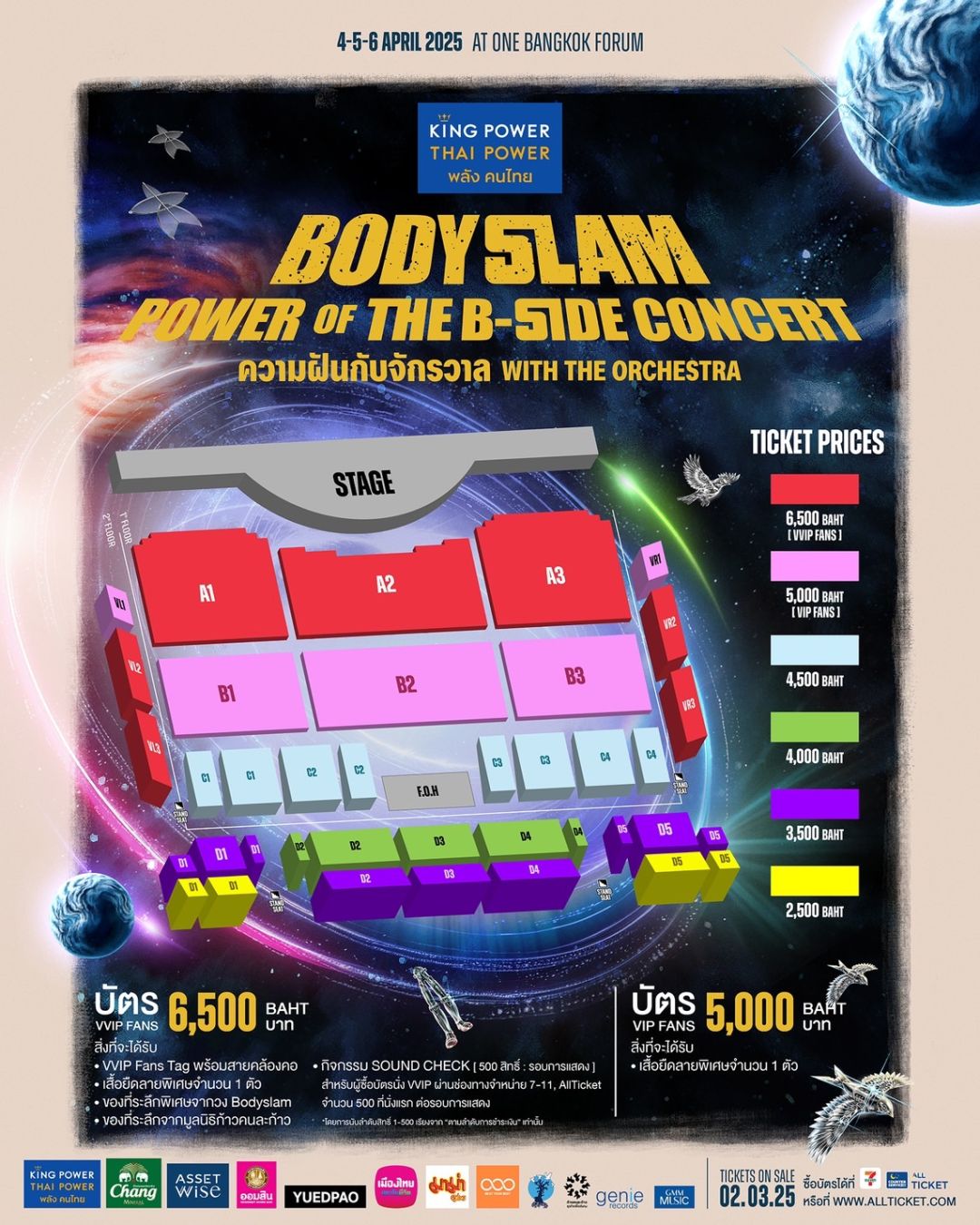 แฟนพันธุ์แท้ของบอดี้สแลมไม่ควรพลาด! ซื้อบัตรพร้อมกัน ในวันอาทิตย์ที่ 2 มีนาคม 2568 เวลา 10:00 น. ที่ Counter Service All Ticket ในร้าน 7-Eleven ทุกสาขาทั่วประเทศ หรือ www.allticket.com บัตรนั่งราคา 6,500 *VVIP / 5,000 **VIP / 4,500 / 4,000 / 3,500 และ 2,500 บาท สำหรับบัตร 6,500 VVIP FANS จะได้รับ TAG VVIP FANS พร้อมสายคล้องคอ / เสื้อยืดลายพิเศษ / ของที่ระลึกจากบอดี้สแลม / ของที่ระลึกจากมูลนิธิก้าวคนละก้าว พิศษสำหรับผู้ซื้อบัตรโซน VVIP 500 ที่นั่งแรก ต่อรอบการแสดง จะได้รับสิทธิ์เข้าร่วมกิจกรรม SOUND CHECK กับวง bodyslam ก่อนโชว์ และบัตร 5,000 VIP Fans จะได้รับเสื้อยืดลายพิเศษ ติดตามความเคลื่อนไหวพร้อมรายละเอียดเพิ่มเติมได้ที่ https://www.facebook.com/bodyslamband