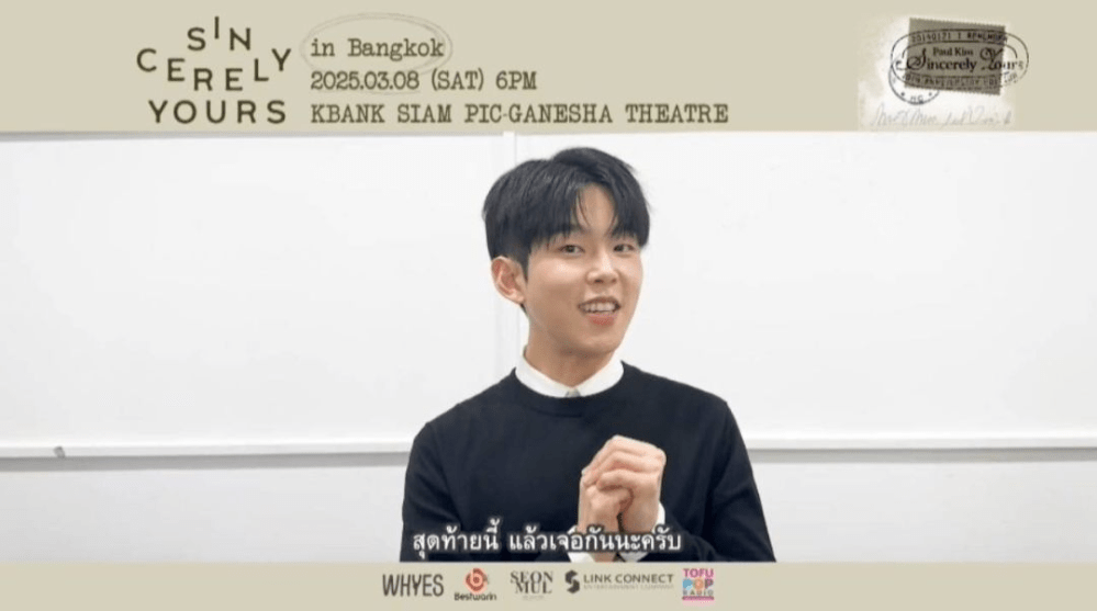 หนุ่ม “พอล คิม” ส่งคลิปพร้อมทักทายเหล่า “Paul in Love” ไทย หลังจากที่ไม่ได้เจอกันมานาน “สวัสดีครับ ผมพอล คิม ครับ สวัสดีครับทุกคน ผมนักร้อง พอล คิม ครับ ไม่ได้เจอกันนานเลย แต่ในวันที่ 8 มีนาคม 2568 นี้ เราจะได้เจอกันแล้วที่งาน “2025 Paul Kim Concert <Sincerely yours> in Bangkok” ครับ เพื่อให้สมกับที่ได้เจอ ไทย พอล อิน เลิฟ อีกครั้งหลังจากไม่ได้เจอกันมานาน ผมได้ตั้งใจเตรียมการแสดงไว้มากมายเลย หวังว่าทุกคนจะมาร่วมสร้างความสนุกและความทรงจำที่ดีไปด้วยกันนะครับ มาสนุกไปด้วยกันเยอะๆ เลยนะครับ รายละเอียดเพิ่มเติมเกี่ยวกับงาน สามารถติดตามได้ที่เพจ Bestwarin For You ครับ สุดท้ายนี้แล้วเจอกันนะครับ ขอบคุณครับ”
