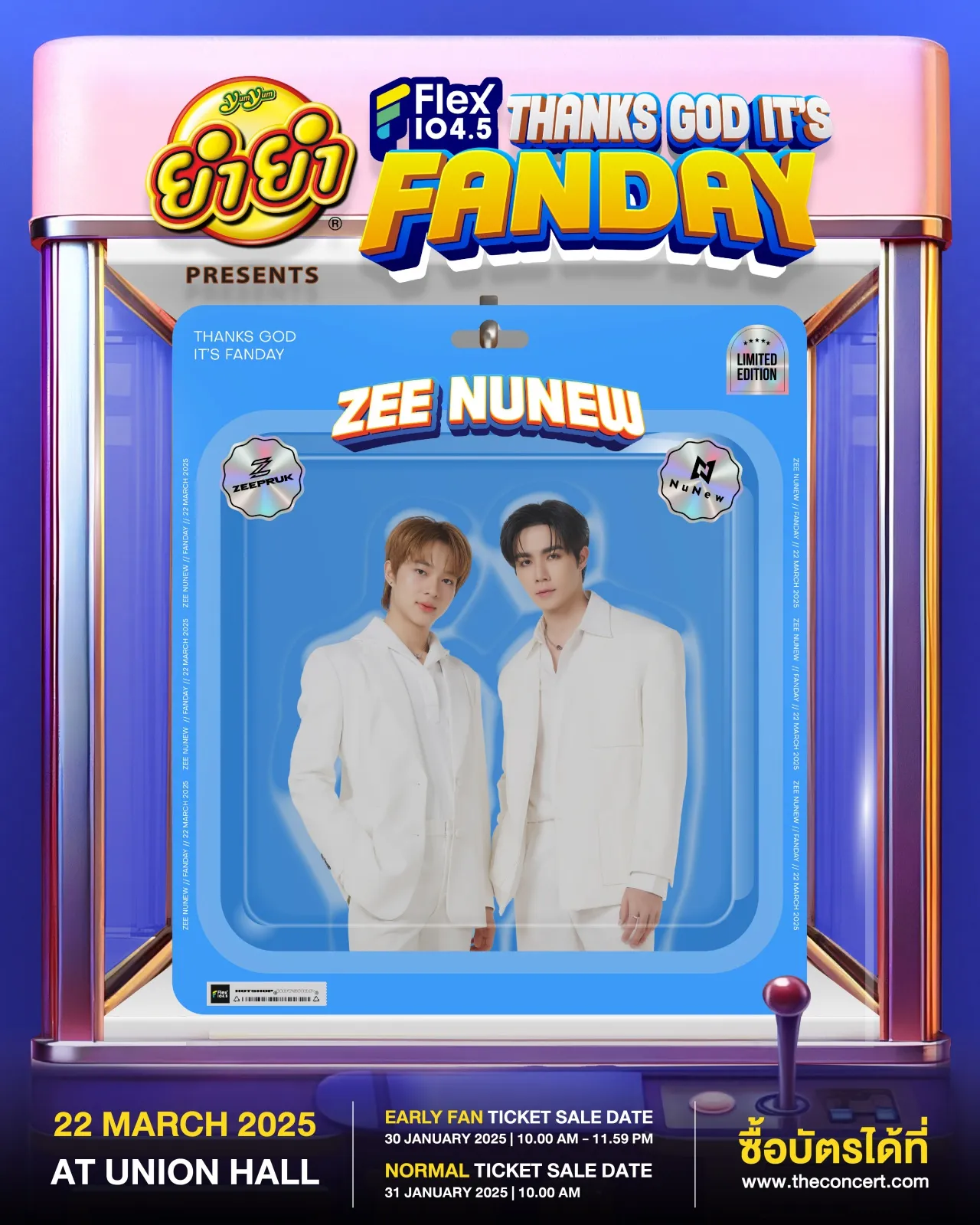 ฟิตหัวใจความเป็นมัมหมีให้พร้อม วอร์มเอเนอร์จี้แฟนให้เต็ม! ** แล้วเตรียมจองบัตรคอนเสิร์ต ยำยำ presents Flex FANDAY “วันแฟนแห่งชาติ” กันได้ทาง เว็บไซต์ theconcert ดีเดย์เปิดขายบัตร EARLY FAN ซึ่งเป็นบัตรราคาพิเศษ จำนวนจำกัด เฉพาะโซน Standing เพียง 1,300 บาท (ราคาปกติ 1,600 บาท) ในวันที่ 30 มกราคม 2568 นี้ ตั้งแต่เวลา 10:00-23:59 น.จากนั้นวันรุ่งขึ้นจะเปิดขายบัตรราคาปกติ โซน Standing บัตรยืน ราคา 1,600 บาท / โซน A บัตรนั่ง ราคา 2,700 บาท (ที่นั่งยกพื้นแบบไล่ระดับ) / โซน B บัตรนั่ง ราคา 1,600 บาท (ที่นั่งอัฒจันทร์) ** ติดตามรายละเอียดเพิ่มเติมได้ทางเฟซบุ๊กออฟฟิเชียลเพจ FanDayConcert รวมทั้งแอปพลิเคชัน FlexConnect และออฟฟิเชียลโซเชียลมีเดียของ Flex 104.5 ทุกแพลตฟอร์ม
