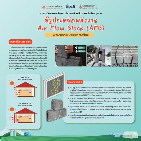 วิทยา สวัสดิ์โรจน์ เจ้าของรางวัลชนะเลิศ ประเภทนวัตกรรมพลังงานด้านการส่งเสริมภาคครัวเรือน ชุมชน กล่าวว่า อิฐประหยัดพลังงาน Air Flow Block สามารถประหยัดพลังงานลดค่าไฟจากการเปิดแอร์ เพราะอิฐระบบนี้จะช่วยระบายอากาศทำให้บ้านเย็นสบาย หากนำอิฐ Air Flow Block มาทดแทนอิฐมวลเบาและอิฐบล็อกทั่วไป ก็จะลดการใช้พลังงาน ได้ประมาณปีละ 1,400 ล้านบาท-2,000 ล้านบาท