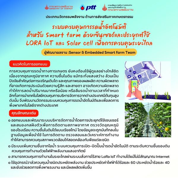 ทีม Sensor & Embedded Smart farm Team นักออกแบบนวัตกรรมพลังงานภาคประชาชน เจ้าของรางวัลชนะเลิศ ประเภทนวัตกรรมพลังงานด้านการส่งเสริมภาคเกษตรกรรม กล่าวถึงผลงานว่า ระบบควบคุมการรดน้ำอัตโนมัติ สำหรับ Smart Farm ด้วยเซ็นเซอร์และประยุกต์ใช้ LORA IoT และ Solar cell เพื่อการควบคุมระยะไกล สามารถนำไปใช้ได้ทั้งกลุ่มเกษตรกร กลุ่มปศุสัตว์ กลุ่มสถาบันการศึกษาและกลุ่มทำ Smart farm ซึ่งควบคุมด้วยระบบ IoT หรือ Internet of Things สามารถสื่อสารภายในฟาร์มโดยไม่ต้องพึ่งไฟฟ้าและอินเตอร์เน็ต เช่น ถ้าความชื้นเกินกว่าที่กำหนดไว้ก็จะเปิดวาล์วน้ำโดยอัตโนมัติ