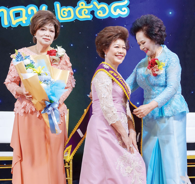 เพ็ญพักตร์ ศรีทอง ปธ.สมาคมสภาแม่ดีเด่นแห่งชาติฯ มอบสายสะพายให้กับสตรีผู้ได้รับรางวัล
