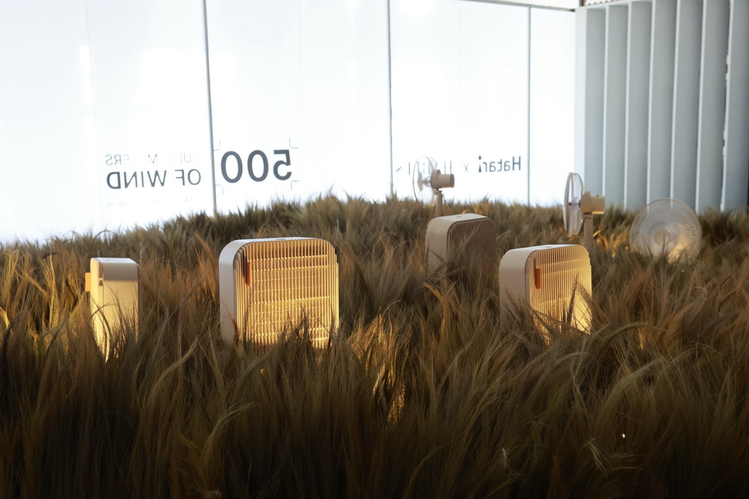 นิทรรศการอิมเมอร์ซีฟ “500 Cubic Meters of Wind: The Art and Power of Design” เป็นผลงานการร่วมมือกันระหว่าง ฮาตาริ และ Habits Design Studio สตูดิโอออกแบบที่เชี่ยวชาญการออกแบบผลิตภัณฑ์จากอิตาลี โดยปีนี้ฮาตาริจำลองบรรยากาศผ่อนคลายของทุ่งหญ้าสีเขียวมาไว้ในพื้นที่ห้องกระจกขนาด 500 ตารางเมตร ประดับประดาไปด้วยใบหญ้าที่พลิ้วไหวด้วยลมอันทรงพลังจากพัดลมของฮาตาริ และมาพร้อมรูปลักษณ์ที่สวยงาม ลงตัวไปกับบรรยากาศโดยรอบ เพื่อชวนผู้ชมออกสำรวจความสัมพันธ์อันทรงพลังระหว่างการออกแบบที่เน้นการใช้งานในเชิงวิศวกรรม และความเชื่อมโยงทางอารมณ์ ซึ่งเป็นแนวคิดหลักของพัดลม ฮาตารินั่นเอง โดยปีนี้นิทรรศการของฮาตาริได้มอบประสบการณ์แบบอิมเมอร์ซีฟที่ผู้ชมจะดำดิ่งไปสู่โลกแห่งการออกแบบที่จะเปิดประสาทสัมผัสทั้งห้า ได้แก่ การมองเห็น, การได้ยิน, การได้กลิ่น, การสัมผัส และรสชาติ ทันทีที่ก้าวเท้าเข้าไปในนิทรรศการ เพื่อเป็นการเน้นย้ำว่าการออกแบบนั้นจำเป็นต้องคำนึงถึงประสบการณ์การรับรู้อันหลากหลาย ไม่ใช่เพียงความสวยงามที่ตาเห็นเท่านั้น