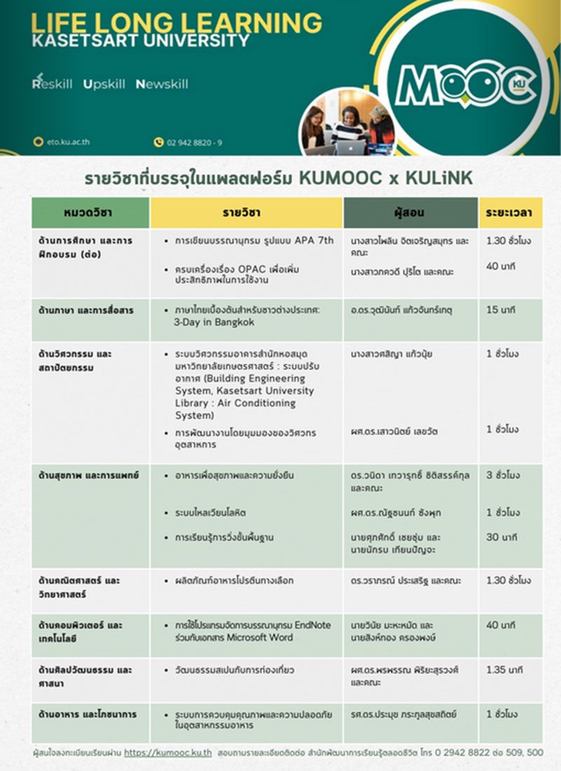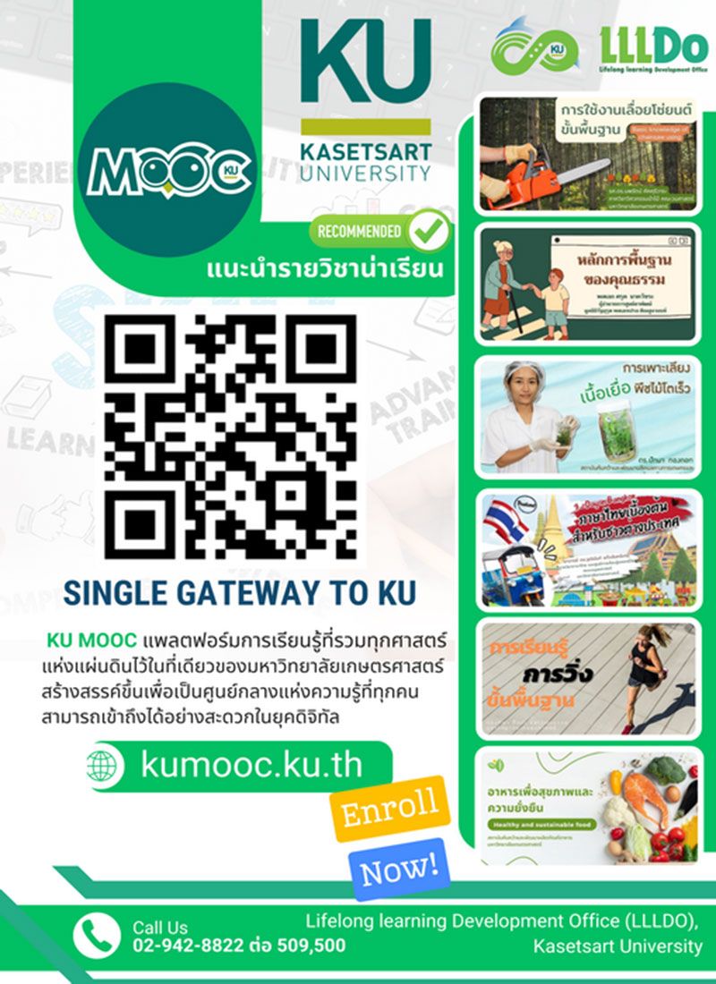 ผู้สนใจลงทะเบียนเรียนผ่าน https://kumooc.ku.th หรือ แสกน QR code สอบถามรายละเอียดติดต่อ สำนักพัฒนาการเรียนรู้ตลอดชีวิต มหาวิทยาลัยเกษตรศาสตร์ โทร 0 2942 8822 ต่อ 509, 500