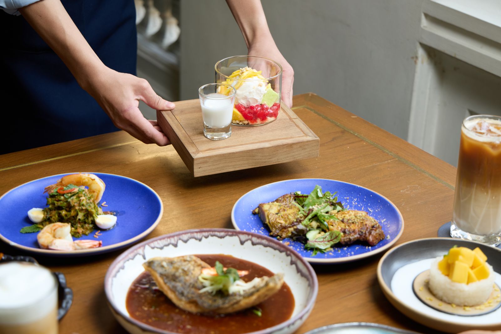 ลิ้มลองเมนูที่เชฟรังสรรค์มาอย่างดีในราคาเพียง 850++ บาทต่อเซ็ต ประกอบไปด้วย เมนูเรียกน้ำย่อย: เลือกจากเมนู ไก่สะเต๊ะ ยำทะเลต้มข่าแห้ง หรือยำถั่วพู อาหารจานหลัก: เลือกจากเมนู แกงแดงอกเป็ด มัสมั่นแก้มวัว กุ้งกระเทียมพริกไทย หรือปลากระพงซอสเปรี้ยวหวานหรือ ไก่ย่างส้มตำ ของหวาน: ปิดท้ายมื้ออาหารด้วยของหวานเลือกจากเมนู ไทยทีรามิสุ ข้าวเหนียวมะม่วง ทับทิมกรอบ เครื่องดื่ม: เพลิดเพลินไปกับกาแฟหรือชาจาก TWG