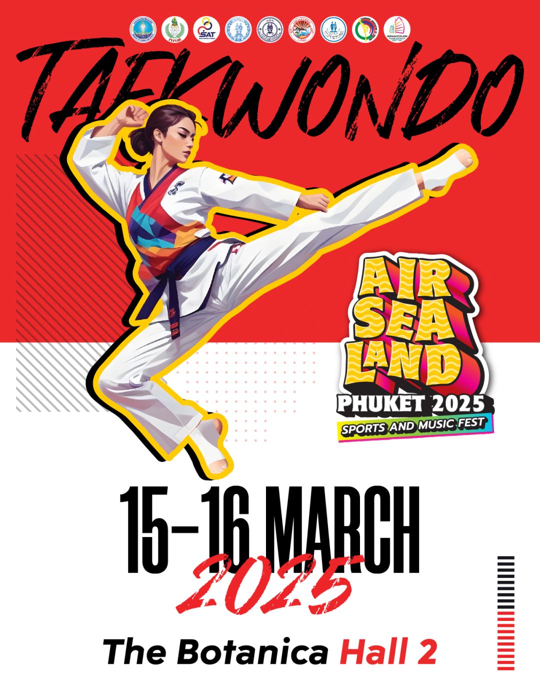 การกีฬาแห่งประเทศไทย (กกท.) ร่วมกับ จังหวัด และศูนย์การค้าจังซีลอน ป่าตอง ภูเก็ต เตรียมจัดการแข่งขันเทควันโด รายการ “Taekwondo Air Sea Land Phuket 2025” ภายใต้การจัดงานเทศกาลกีฬาและการท่องเที่ยว “Air Sea Land Phuket 2025 Sports and Music Fest” เพื่อตอกย้ำปี Amazing Thailand Grand Tourism and Sports และเป้าหมายในการสร้างรายได้จากอุตสาหกรรมการท่องเที่ยวและกีฬา โดยการแข่งขันเทควันโด แบ่งออกเป็น 2 ประเภท ได้แก่ ประเภทต่อสู้ – เคียวรูกิ (Kyorugi) และประเภทท่ารำ – พุมเซ่ (Poomsae) เพื่อจะมาวัดพลัง ความเร็ว และสุดยอดเทคนิคบนสังเวียนนักสู้ โดยการแข่งขันจะจัดขึ้นในระหว่างวันที่ 15 -16 มีนาคม 2568 ตั้งแต่เวลา 11.00 – 16.00 น. ณ ชั้น G โซนเดอะโบทานิกา ฮอลล์ 2 ศูนย์การค้าจังซีลอน ป่าตอง ภูเก็ต