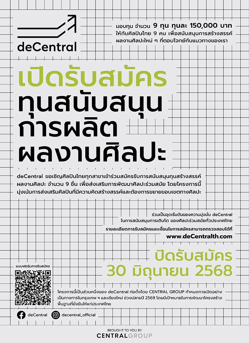 เพื่อเป็นการเตรียมความพร้อมและสร้างแรงขับเคลื่อนให้กับวงการศิลปะไทย ‘deCentral’(ดีเซ็นทรัล) จึงได้เปิดตัวโครงการ “ทุนสนับสนุนการผลิตผลงานศิลปะ” (Production Grant) เพื่อสนับสนุนศิลปินไทยรุ่นใหม่และศิลปินที่มีประสบการณ์แต่มีข้อจำกัดด้านทุนทรัพย์ ให้สามารถสร้างสรรค์ผลงานใหม่ที่สะท้อนแนวคิดร่วมสมัยและวิพากษ์ประเด็นสังคมและโลกที่กำลังเผชิญในปัจจุบัน พร้อมพัฒนางานศิลป์ที่มีคุณค่าอย่างเต็มที่ โดยจะมอบ ทุนจำนวน 9 ทุน มูลค่าทุนละ 150,000 บาท (เงื่อนไขเป็นไปตามที่กำหนด) ผลงานที่ได้รับทุนสนับสนุนจะถูกนำมาเป็นส่วนหนึ่งของการจัดแสดงที่ ‘deCentral’ เพื่อเปิดโอกาสให้ผู้คนในแวดวงศิลปะ นักสะสม ภัณฑารักษ์ และผู้ชมจากทั่วโลกได้ชื่นชม