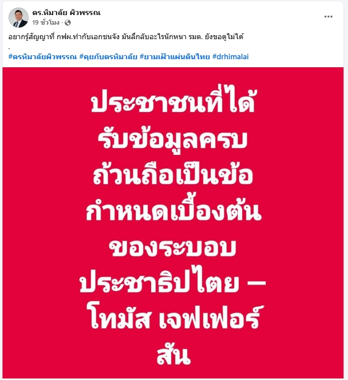 25 เมษายน 2568 ดร.หิมาลัย ผิวพรรณ ผู้อำนวยการพรรครวมไทยสร้างชาติ (รทสช.) ที่ปรึกษารองนายกรัฐมนตรีและรมว.พลังงาน แชร์ข้อความ “ประชาชนที่ได้รับข้อมูลครบถ้วนถือเป็นข้อกำหนดเบื้องต้นของระบอบประชาธิปไตย” ของ โทมัส เจฟเฟอร์สัน อดีตประธานาธิบดีสหรัฐ อเมริกา