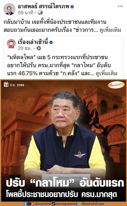 15 มิถุนายน 2568 นายอาสพลธ์ สรรณ์ไตรภพ สส.ศรีสะเกษ พรรคภูมิใจไทย (ภท.) โพสต์ฟสบุ๊กส่วนตัว พร้อมรูปผล “มหิดลโพล” ที่ระบุประชาชาอยากให้ปรับ นายภูมิธรรม เวชยชัย รองนายกฯ และ รมว.กลาโหม มากที่สุด โดยมีเนื้อหาว่า…
