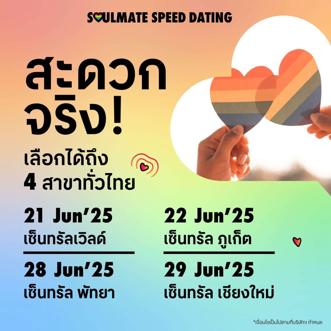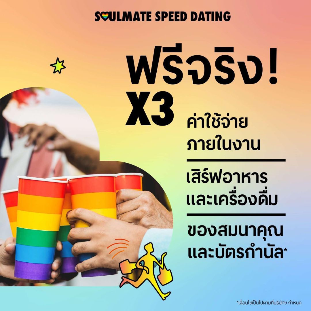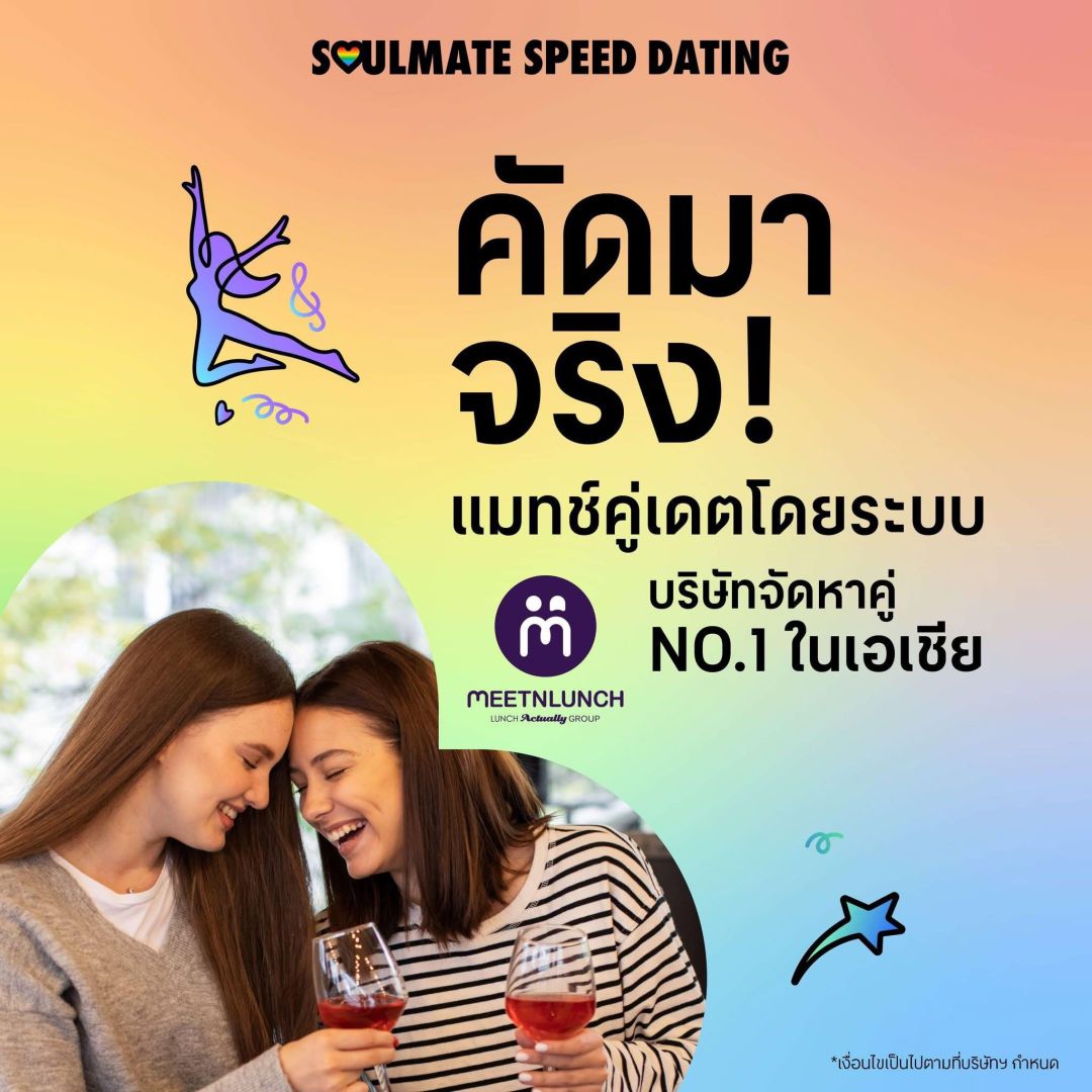 SOULMATE Speed Dating เพิ่มโอกาสให้คุณได้เจอคนที่ใช่ ในเวลาอันรวดเร็วและตรงใจ การันตีคุณภาพผู้ร่วมงานโดย MeetNLunch มาพร้อมกับ Vibes ที่ปลอดภัย สนุกและเป็นกันเอง ไม่ว่าคุณจะเป็น Lesbian, Gay, Bisexual, Transgender, Queer/Questioning หรืออื่นๆ เรายินดีต้อนรับด้วยความเข้าใจ โอกาสที่มากกว่าความรัก คือมิตรภาพใหม่ๆ ที่รอคุณอยู่ พร้อมไฮไลต์ ฟรีจริง! x3 : ฟรี ไม่มีค่าใช้จ่าย, ฟรี อาหารและเครื่องดื่มภายในงาน, ฟรี ของสมนาคุณและบัตรกำนัล
