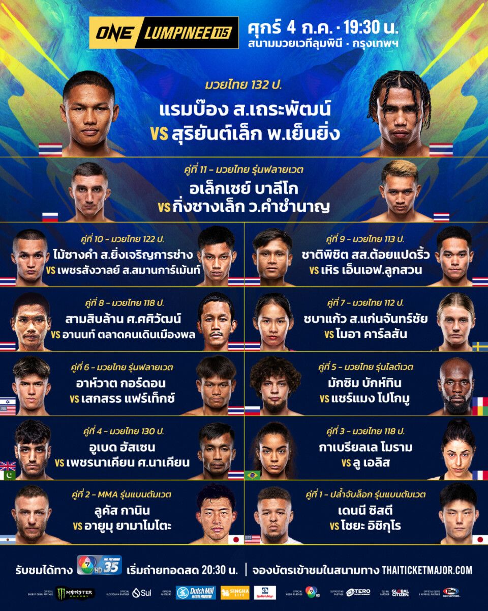 ช่อง 7HD สาดความมัน ให้ลุ้นคู่มวยเดือดแบบจัดเต็ม ประเดิมต้นเดือนกรกฎาคม เริ่มด้วย วันศุกร์ที่ 4 กรกฎาคมนี้ พบกับศึก ONE ลุมพินี 115 ขนทัพนักสู้บู๊ระห่ำรวม 12 คู่ โดยคู่เอกเป็นการเปิดศึกภาค 4 ระหว่าง แรมบ๊อง ส.เถระพัฒน์ กำปั้นขาลุย จากลำพูน พร้อมดับเครื่องชน สุริยันต์เล็ก พ.เย็นยิ่ง นักชกหมัดหนักวัยเดียวกันจากมหาสารคาม ที่ขอกู้ฟอร์มเก่งกลับมาเก็บชัย ด้านคู่เอกภาคอินเตอร์ อาห์วาต กอร์ดอน กำปั้นฟอร์มฮอต ตัวแทนจากสหรัฐอเมริกา-อิสราเอล กลับมาท้าแลกเดือด เสกสรร แฟร์เท็กซ์ นักสู้มาดกวน จากอุดรธานี ที่หวังเก็บชัยชนะต่อเนื่องให้ได้ แฟนหมัดมวยห้ามพลาดเด็ดขาด