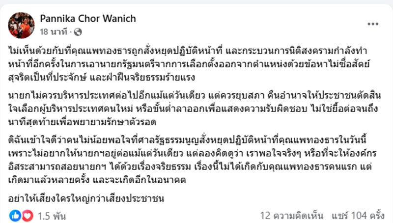 ดิฉันเข้าใจดีว่าคนไม่น้อยพอใจที่ศาลรัฐธรรมนูญสั่งหยุดปฏิบัติหน้าที่คุณแพทองธารในวันนี้ เพราะไม่อยากให้นายกฯอยู่ต่อแม้แต่วันเดียว แต่ลองคิดดูว่า เราพอใจจริงๆ หรือที่จะให้องค์กรอิสระสามารถสอยนายกฯ ได้ด้วยเรื่องจริยธรรม เรื่องนี้ไม่ได้เกิดกับคุณแพทองธารคนแรก แต่เกิดมาแล้วหลายครั้ง และจะเกิดอีกในอนาคต