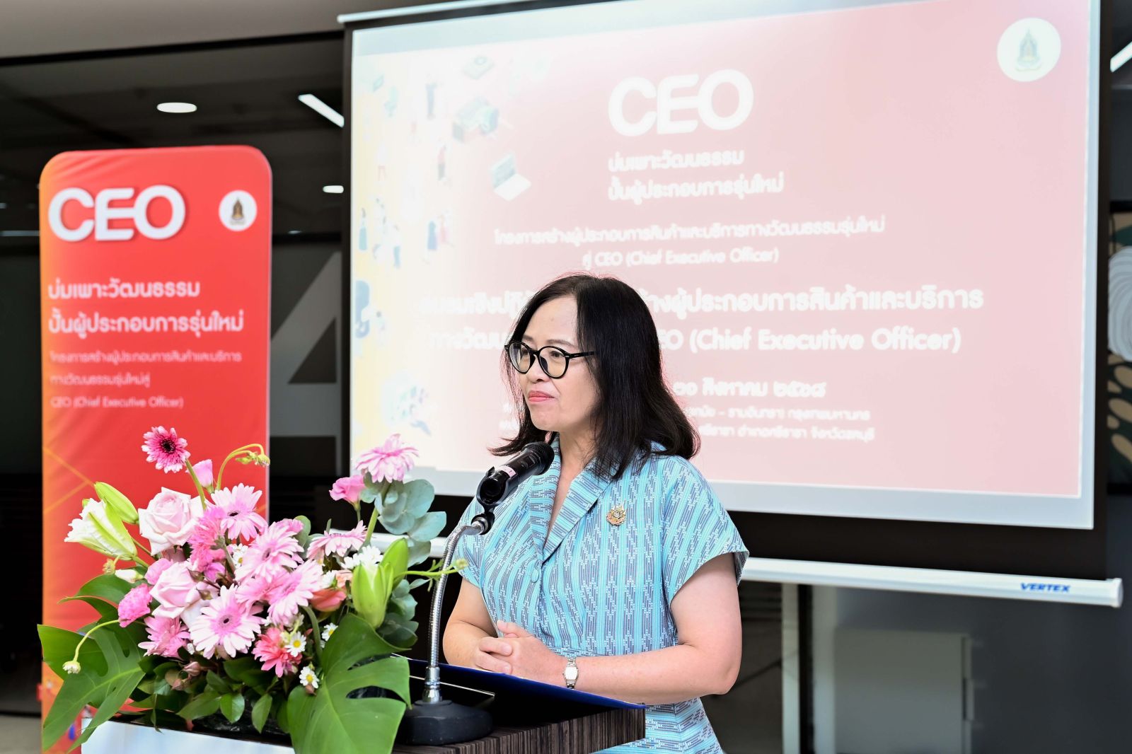 นางรักชนก โคจรานนท์ รองปลัดกระทรวงวัฒนธรรม ให้เกียรติเป็นประธานในพิธีเปิดการอบรมฯ ณ SCG HOME Experience โดยมี นางสาวผกาพรรณ แสนนรินทร์ นักวิชาการวัฒนธรรมชำนาญการพิเศษ ได้กล่าวรายงาน โอกาสนี้ นางรักชนก ได้กล่าวว่า การอบรมเชิงปฏิบัติการ การสร้างผู้ประกอบการสินค้าและบริการทางวัฒนธรรมรุ่นใหม่สู่ CEO (Chief Executive Officer) ภายใต้แนวคิด “CEO : Culture Empowers Opportunity – Youth Camp วัฒนธรรมสร้างโอกาส สู่ผู้นำรุ่นใหม่” ซึ่งสะท้อนถึงพลังของวัฒนธรรมในการสร้างโอกาสใหม่ ๆ ให้กับเยาวชนไทย โครงการนี้เป็นเวทีสำคัญในการพัฒนาศักยภาพของเยาวชนรุ่นใหม่ให้สามารถนำทุนทางวัฒนธรรมมาสร้างสรรค์เป็นสินค้าและบริการที่มีคุณค่า ตอบโจทย์ตลาดสมัยใหม่ และมีความยั่งยืนทั้งด้านเศรษฐกิจ สังคม และสิ่งแวดล้อม