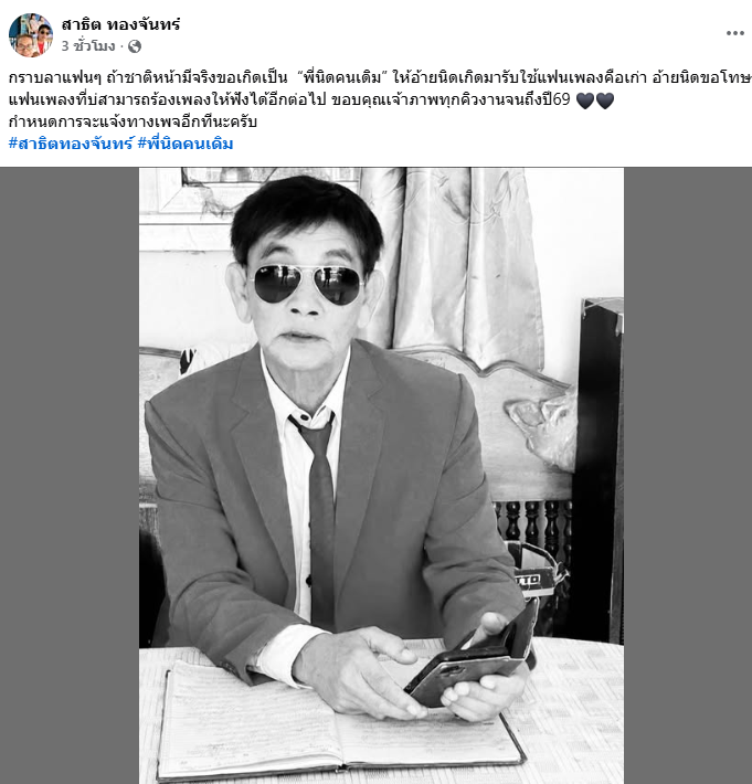 ขณะที่เฟซบุ๊ก สาธิต ทองจันทร์ ยังได้โพสต์ข้อความอำลาครั้งสุดท้ายด้วยว่า กราบลาแฟนๆ ถ้าชาติหน้ามีจริงขอเกิดเป็น “พี่นิดคนเดิม” ให้อ้ายนิดเกิดมารับใช้แฟนเพลงคือเก่า อ้ายนิดขอโทษแฟนเพลงที่บ่สามารถร้องเพลงให้ฟังได้อีกต่อไป ขอบคุณเจ้าภาพทุกคิวงานจนถึงปี69 กำหนดการจะแจ้งทางเพจอีกทีนะครับ #สาธิตทองจันทร์ #พี่นิดคนเดิม