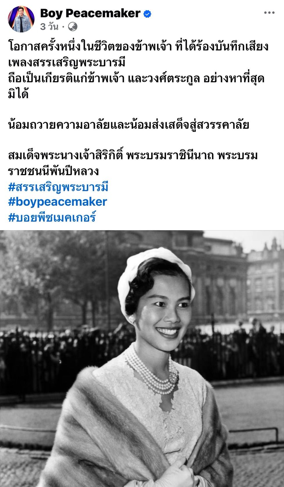 ‘บอย พีซเมคเกอร์’สุดปลื้ม ได้รับเกียรติร้องบันทึกเสียงเพลง ‘สรรเสริญพระบารมี’ น้อมถวายความอาลัยแด่ สมเด็จพระบรมราชชนนีพันปีหลวง
