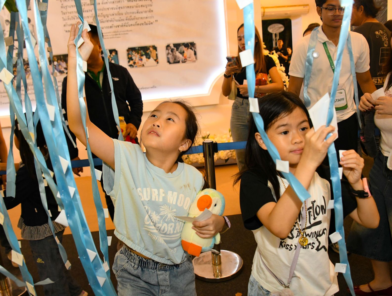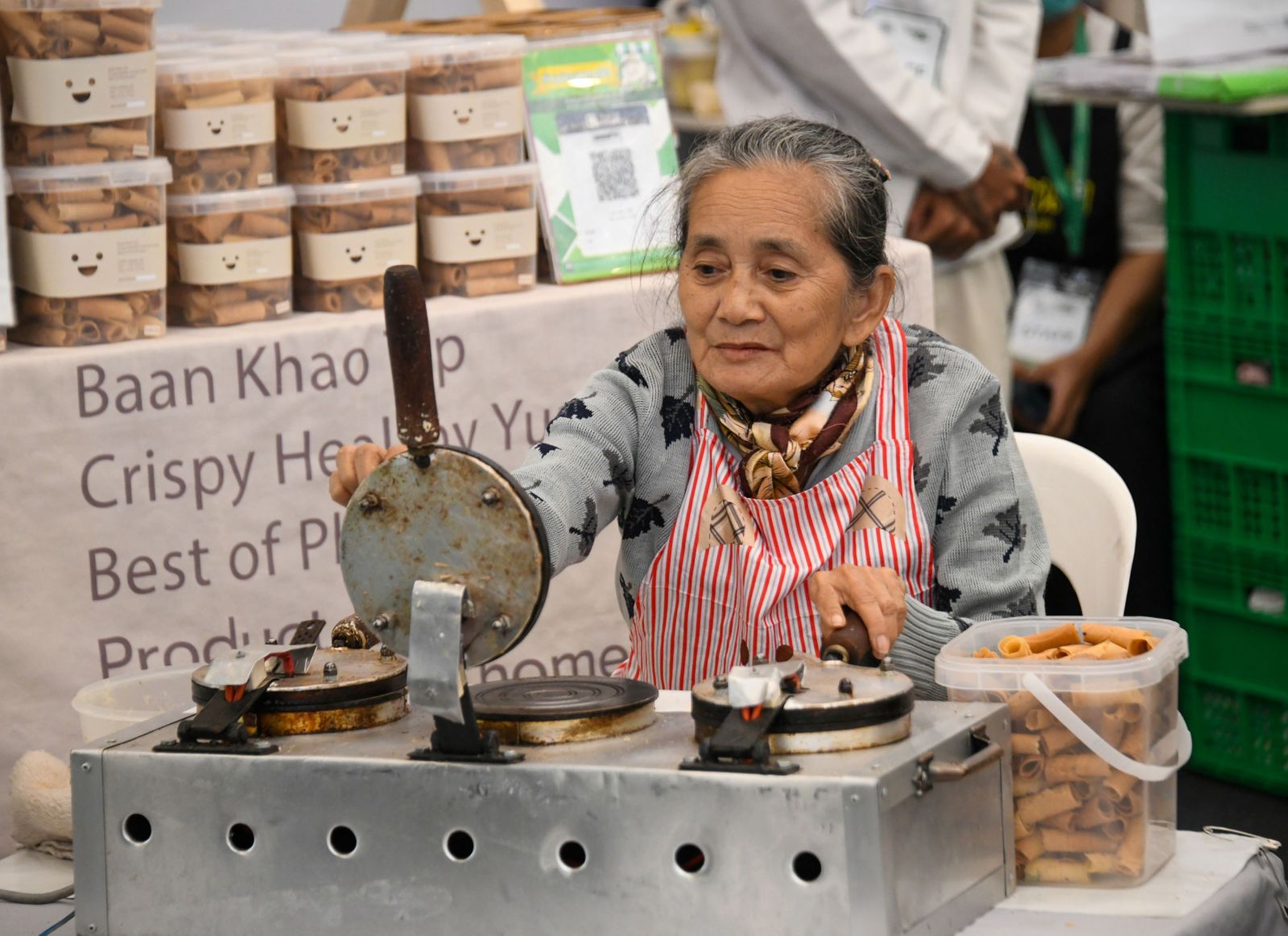 เรียกว่าบรรยากาศคึกคักกันตั้งแต่วันแรกเลยทีเดียว มีผู้สนใจเยี่ยมชมนิทรรศการที่จัดขึ้นอย่างงดงาม ภายใต้แนวคิด “สายใยแผ่นดิน” เพื่อสานต่อพระราชปณิธานสมเด็จพระนางเจ้าสิริกิติ์ พระบรมราชินีนาถ พระบรมราชชนนีพันปีหลวง และร่วมสนุกกับกิจกรรมต่างๆ ภายในบูทกันอย่าเนืองแน่นตลอดทั้งวัน ซึ่งนอกจากทุกคนจะโฟกัสมาที่กิจกรรมสอยดาว และห้องภาพฉายานิติกรอันเลื่องชื่อแล้ว อีกหนึ่งไฮไลต์ของบูทไทยเบฟที่ดึงดูดทุกคน ก็คือโซนร้านค้าชุมชน เครือข่ายรู้รักสามัคคี ที่ล้วนเป็นของดีให้ได้เลือกชมเลือกซื้อด้วยราคาสบายใจ โดยเฉพาะร้านขนมทองม้วนเจ้าดังจากเมืองเพชรสูตรต้นตำรับของ คุณยายวรรณา อินมี หรือยายเล็ก ผู้คิดสูตร บอกเลยว่า คุณยายไม่หวงสูตรด้วย หากใครสนใจอยากไปทำเอง ซึ่งคุณยายก็น่ารักมากๆ ขวักมือเรียกลูกค้าให้มาชิม มาลองนั่งทำด้วยตัวเอง ทั้งม้วน ทั้งขายกันแทบไม่ทันเลยทีเดียว