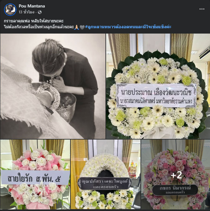 โดยปู มัณฑนา ได้โพสต์ภาพขณะรดน้ำศพคุณพ่อ พร้อมข้อความอาลัยสุดซึ้ง ระบุว่า “กราบลาคุณพ่อ หลับให้สบายนะคะ ไม่ต้องกังวลหรือเป็นห่วงปูอีกแล้วนะคะ #ลูกหลานทหารอดทนและเข้มแข็งค่ะ”