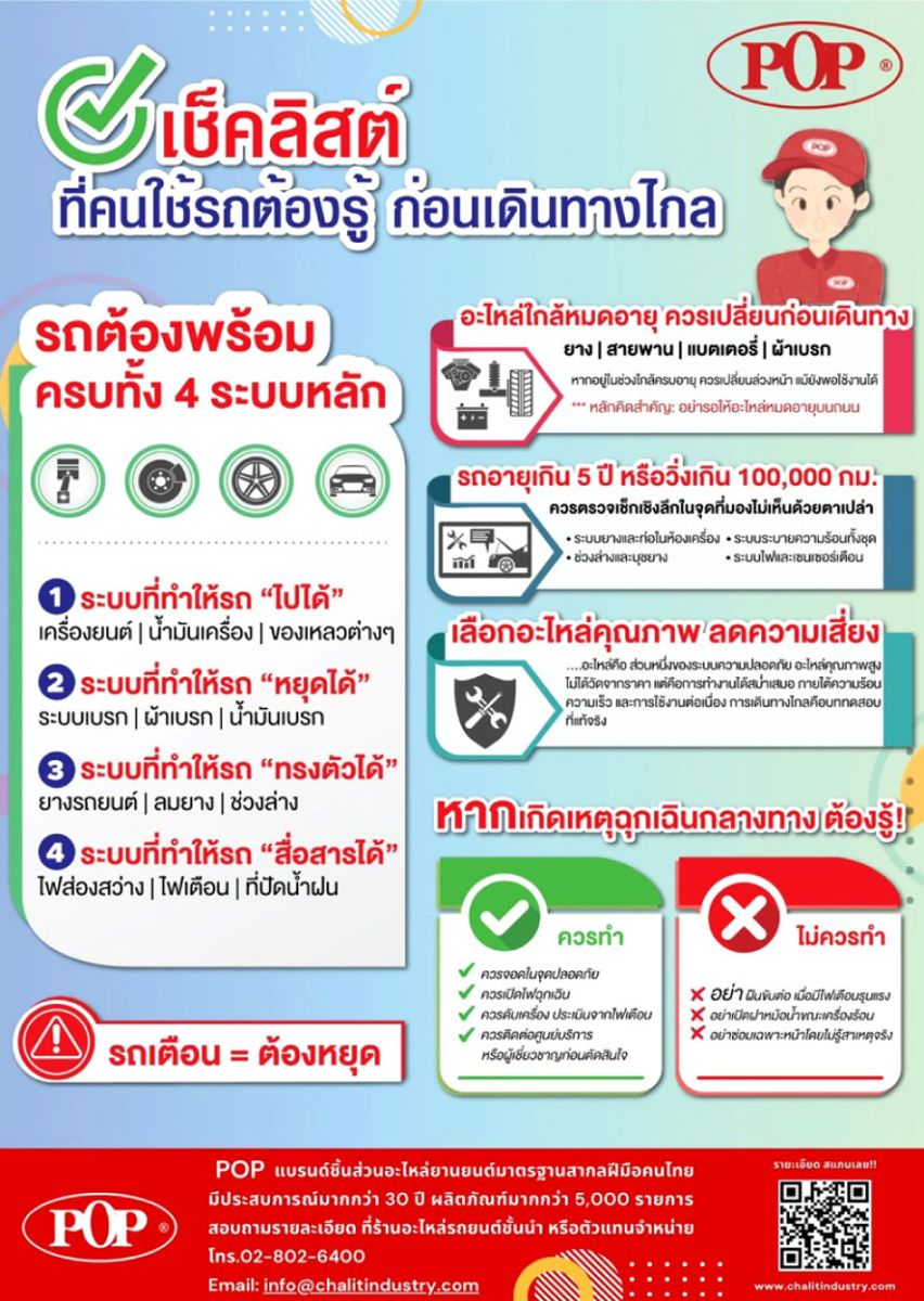 ในช่วงเทศกาลปีใหม่นี้ ก่อนเดินทางไกล ผู้ขับขี่ต้องเตรียมรถให้พร้อม และเตรียมคนขับขี่ให้พร้อมด้วย เพื่อกลับถึงจุดหมายปลายทางอย่างราบรื่นปลอดภัยในทุกเส้นทาง สำหรับบริษัท ชลิต อินดัสทรี จำกัด เป็นผู้ผลิตและจำหน่ายชิ้นส่วนยานยนต์รายใหญ่ของไทย ภายใต้แบรนด์ “POP” ที่ ซึ่งได้รับการยอมรับในอุตสาหกรรมยานยนต์มาอย่างยาวนานมากกว่า 30 ปี โดยมุ่งเน้นการผลิตชิ้นส่วนที่มีความทนทานและได้มาตรฐานสากล เพื่อเสริมสร้างความปลอดภัยในการขับขี่ของผู้ใช้รถยนต์ครอบคลุมตั้งแต่รถยนต์ส่วนบุคคลจนถึงรถยนต์เพื่อการพาณิชย์ สอบถามรายละเอียด ที่ร้านอะไหล่รถยนต์ชั้นนำ ตัวแทนจำหน่าย หรือเว็บไซต์ https://chalitindustry.com