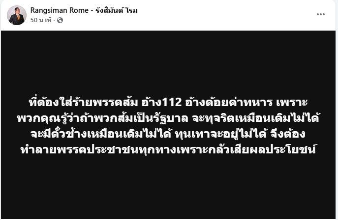 เมื่อวันที่ 3 ม.ค.2568 นายรังสิมันต์ โรม รองหัวหน้าพรรคประชาชน (ปชน.) ได้โพสต์ข้อความผ่านเฟซบุ๊ก ระบุว่า “ที่ต้องใส่ร้ายพรรคส้ม อ้าง112 อ้างด้อยค่าทหาร เพราะ พวกคุณรู้ว่าถ้าพวกส้มเป็นรัฐบาล จะทุจริตเหมือนเดิมไม่ได้ จะมีตั๋วช้างเหมือนเดิมไม่ได้ ทุนเทาจะอยู่ไม่ได้ จึงต้องทำลายพรรคประชาชนทุกทางเพราะกลัวเสียผลประโยชน์”