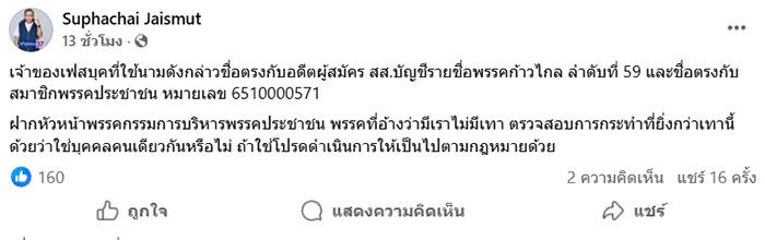 “ศุภชัย”จี้”ปชน.”สอบลูกพรรคโพสต์เท็จ ซัดพฤติกรรมยิ่งกว่าเทา หลังพบชื่อพัวพัน”เฟกนิวส์” เตือนอย่าแชร์ อาจติดคุกได้