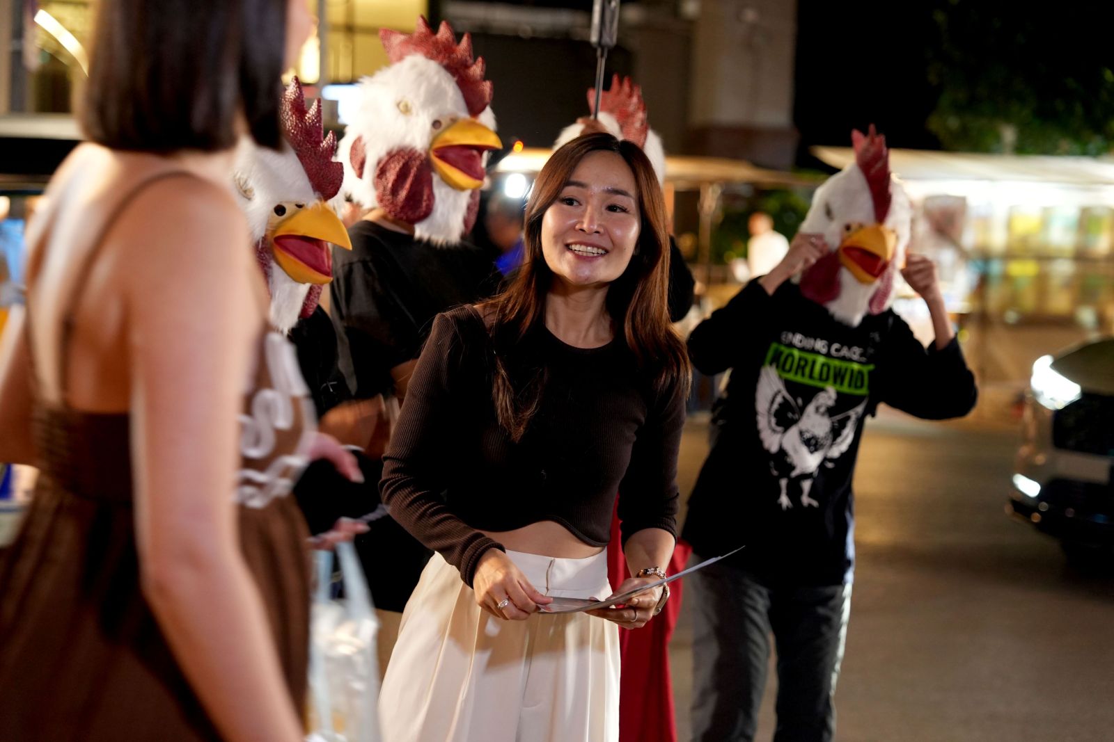 การมีส่วนร่วมของชุมชน: กลุ่มอาสาสมัครและม๊อบหน้ากากไก่ร่วมแจกใบปลิวข้อมูลหลายภาษาแก่ประชาชนและนักท่องเที่ยวในย่านตลาดไนท์บาซ่า เพื่อชวนให้สังคมตระหนักถึงความสำคัญของการเปลี่ยนผ่านไปสู่ระบบการผลิตที่มีมนุษยธรรมมากขึ้น ซึ่งได้รับความสนใจและเสียงตอบรับในเชิงบวกจากผู้สัญจรไปมา“กิจกรรมนี้ไม่ใช่เพียงการสร้างความตระหนักรู้แก่สาธารณชนเกี่ยวกับสภาพความเป็นอยู่ของสัตว์ในอุตสาหกรรมเท่านั้นแต่เราต้องการชี้ให้เห็นบทบาทของภาคธุรกิจขนาดใหญ่ ที่สามารถเป็นแรงขับเคลื่อนสำคัญในการยกระดับมาตรฐานด้านสวัสดิภาพสัตว์ในระดับภูมิภาคที่ดีขึ้นได้” สุภาภรณ์ คิดกล้า ผู้อำนวยการ FACT ประเทศไทย กล่าว