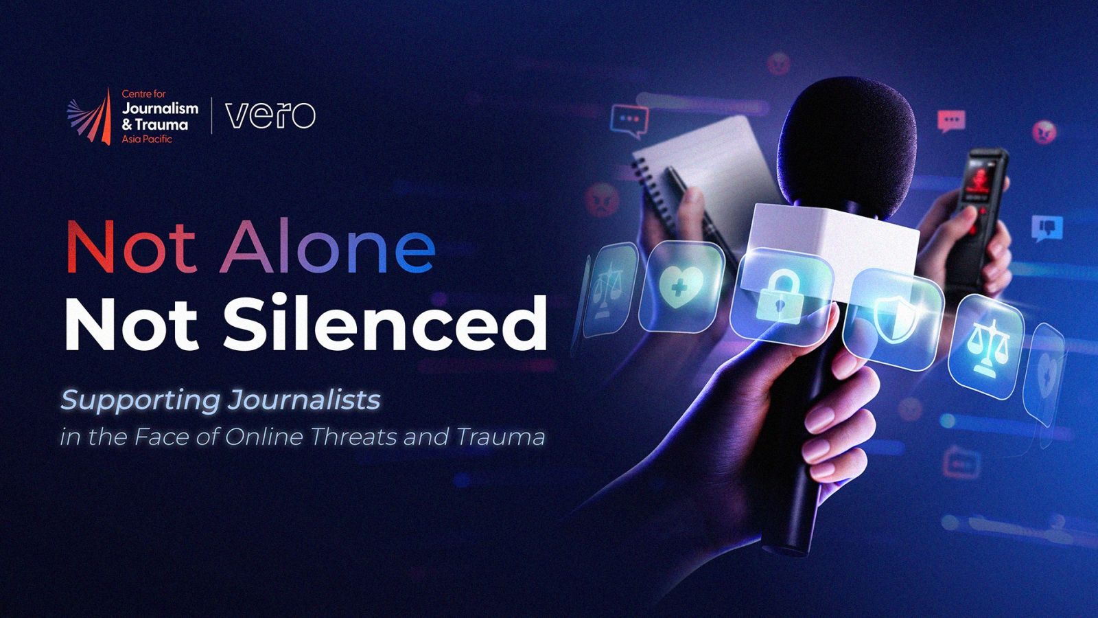 เพื่อสานต่อพันธกิจนี้ วีโร่ (Vero) บริษัทที่ปรึกษาด้านการสื่อสาร ประชาสัมพันธ์ และการตลาดดิจิทัลในภูมิภาคเอเชียตะวันออกเฉียงใต้ จึงได้จับมือกับ CJT เพื่อร่วมกันจัดโครงการอบรมในชื่อ “Not Alone. Not Silenced” อันเป็นโครงการมอบทุนศึกษาเพื่อสนับสนุนความปลอดภัยทางดิจิทัลและความเข้มแข็งทางจิตใจสำหรับนักข่าวทั่วภูมิภาค