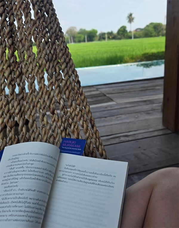 แต่ที่ทำเอาแฟนคลับโฟกัสผิดจุด เห็นจะเป็นหนังสือที่ก้อยกำลังนั่งอ่านอยู่ริมทุ่งนา ซึ่งหลายคนสังเกตว่าเป็นผลงานเรื่องสั้นของนักเขียนชื่อดังชาวญี่ปุ่น Haruki Murakami ที่เคยเป็นหนึ่งในเล่มที่พิธาแนะนำให้อ่าน และเจ้าตัวก็เคยพูดถึงหนังสือเล่มดังกล่าวมาก่อน